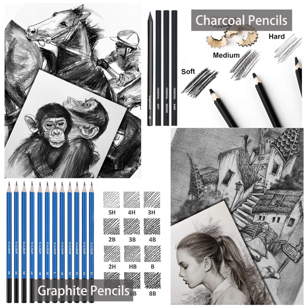 O kit inclui lápis de sketch em diferentes durezas, lápis de carvão, grafite integral, esfuminhos, apontador metálico, borracha vinílica, extensor de lápis e bloco de lixa, cobrindo etapas de desenho estrutural, sombreamento e acabamento. Um bloco para sketch e um livro de colorir acompanham o conjunto, permitindo iniciar exercícios de desenho e coloração sem necessidade de materiais extras.