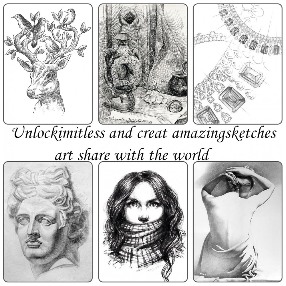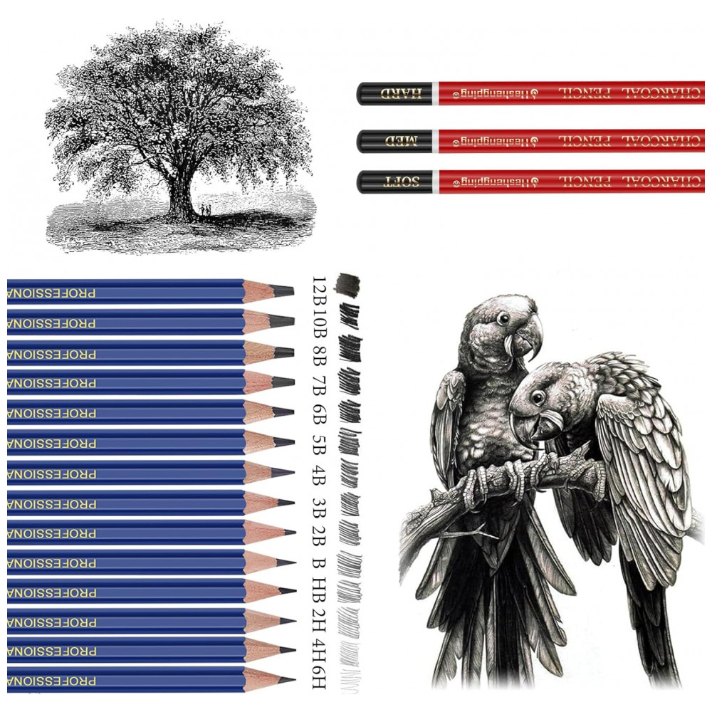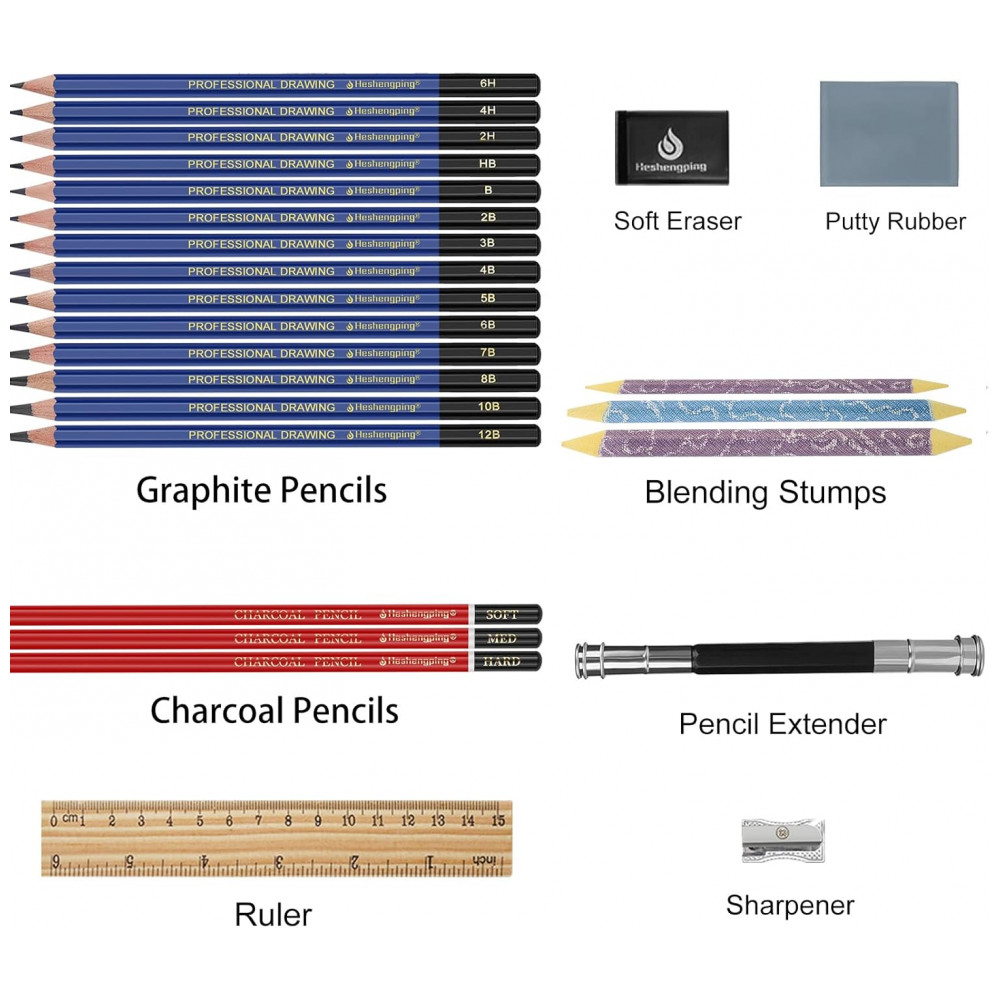 O conjunto inclui 14 lápis grafite pré-apontados, com graduações que vão de 12B a 6H, permitindo traços suaves, sombreados intensos e linhas finas de construção. Três lápis de carvão (macio, médio e duro) complementam as opções de contraste para ilustrações em preto e cinza.