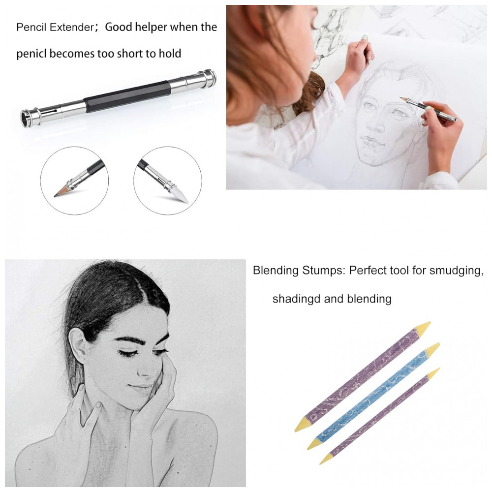 Entre os acessórios estão borracha branca, borracha maleável, três esfuminhos em tamanhos diferentes, apontador, extensor de lápis e pequena régua. Esses itens suportam correção de traços, mistura de grafite e carvão, detalhamento e medição simples em esboços.