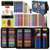 Todo o conteúdo é organizado em estojo em rolo de lona, com suportes individuais para lápis e ferramentas. O formato enrolável facilita o transporte em mochila ou bolsa, mantendo os materiais protegidos e acessíveis para uso em deslocamentos e sessões de desenho ao ar livre.