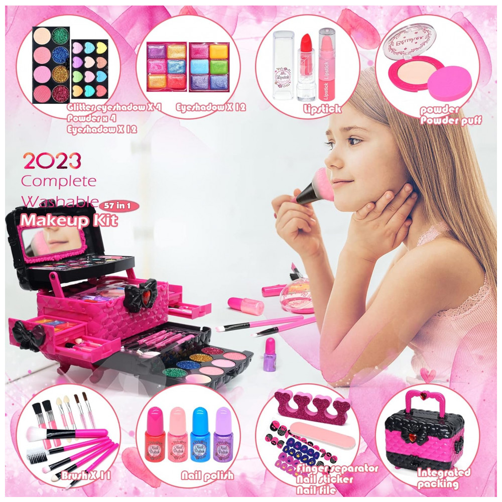 Kit de maquiagem infantil brinquedos para meninas: Kit de maquiagem infantil para meninas Conjunto de maquiagem de 57 unidades, incluindo-sombras-sobrancelhas-blushes-cera blush-gloss labiais-batons com cores-pó prensado-pincéis de maquiagem-esmaltes-unhas arquivo e estojo de cosméticos com espelho-pincel de maquiagem-esponja de maquiagem-etc. presentes de natal para crianças brinquedos para meninas de 5 anos ou mais