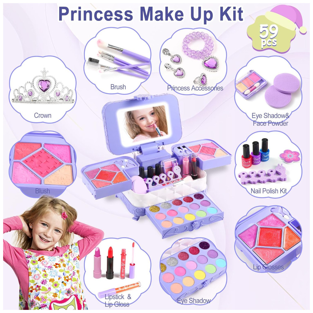 Conjunto de maquiagem de 57 peças para meninas: Esta maquiagem feminina vem com tudo que você precisa. Inclui sombra x 15, brilho labial x 5, blush x 5, pó facial x 2, batons x 2, esmaltes labiais x 2, pincéis x 5, pincéis de blush x 2, pincéis de brilho labial x 2, esponjas de pó x 2, brincos de gema x 2, coroa de princesa x 1, colar de gema x 1, anel de gema x 1, esmalte de unha x 3, separador de dedo do pé x 1, lixa de unha x 1, espelho iluminado x 1, caixa de cosméticos x 1, caixa de presente x 1, manual do usuário x1, chave de fenda x 1.
