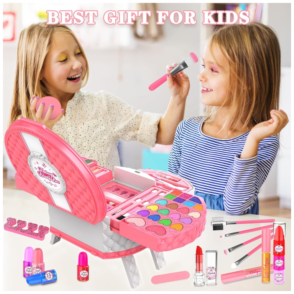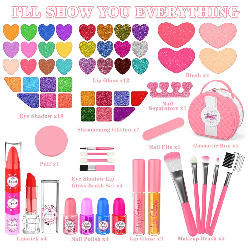 Pacote de valor de maquiagem infantil: inclui 12 brilhos labiais, 19 sombras coloridas, 4 pincéis de sombra, 2 esmaltes labiais, 4 batons, 4 esmaltes, 5 pincéis de maquiagem, 7 brilhos cintilantes, 1 lixa de unha, 1 separador de unhas, 4 blushes, 1 Puffs, 1 Espelho e 1 Caixa de Cosméticos! Suas meninas vão parecer lindas princesas com esse kit de maquiagem!