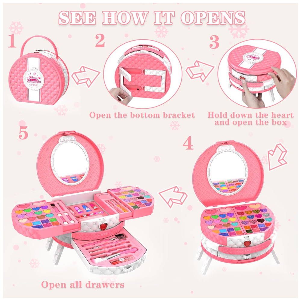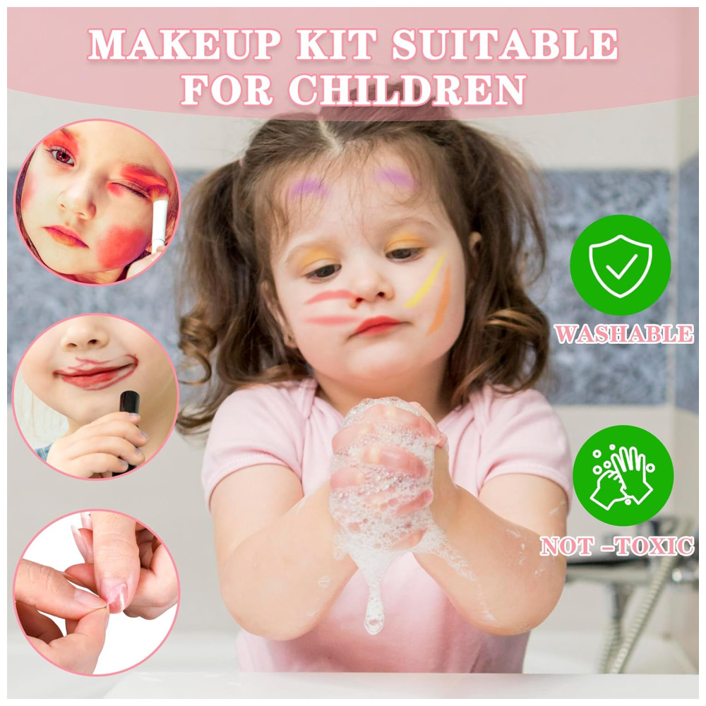 Seguro e não tóxico: nossos brinquedos de maquiagem de alta qualidade são feitos com materiais não tóxicos que passaram por todos os padrões de segurança de brinquedos e cosméticos dos EUA, garantindo que sejam seguros para a pele do seu filho. Os pais podem confiar neste kit não só pela sua segurança, mas também pela sua brincadeira divertida e criativa!