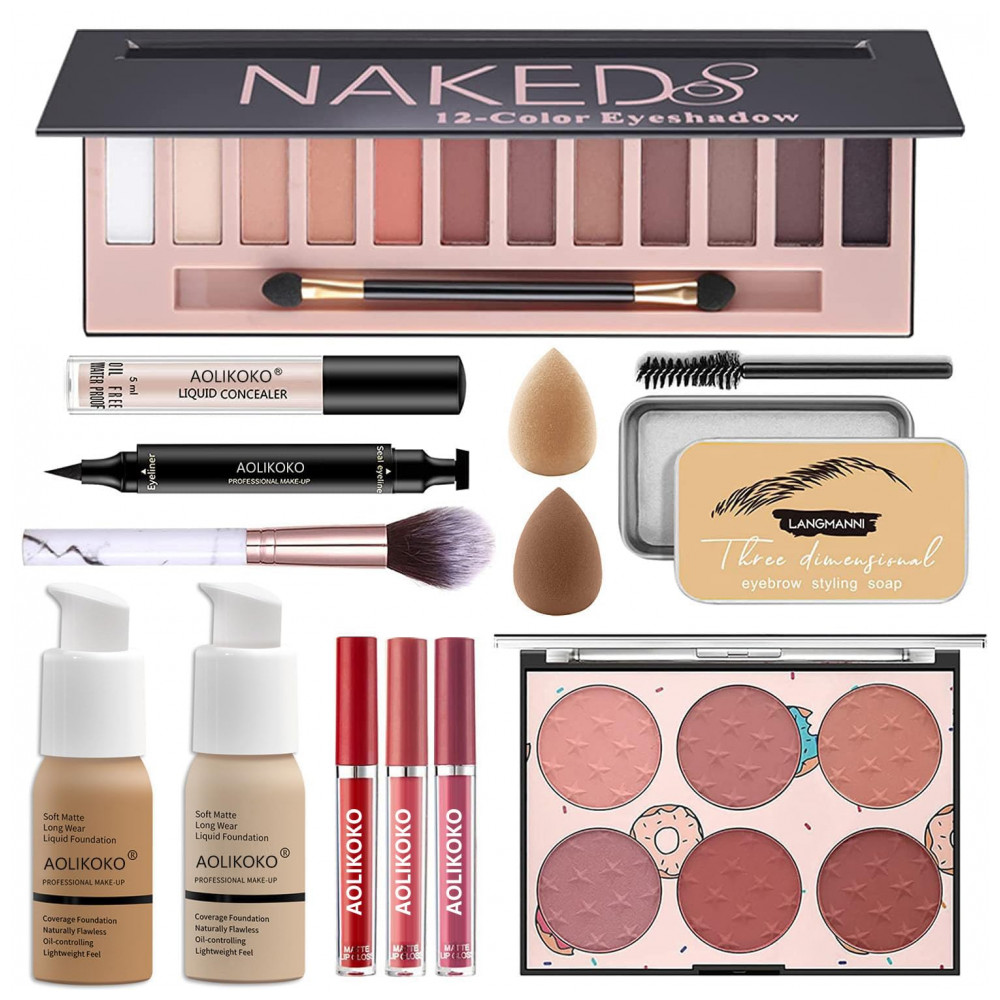 Kit de Maquiagem Profissional 12 Cores AOLIKOKO Sombras Matte Shimmer Base Primer Batom Líquido Corretivo Blush Máscara Delineador Pincel