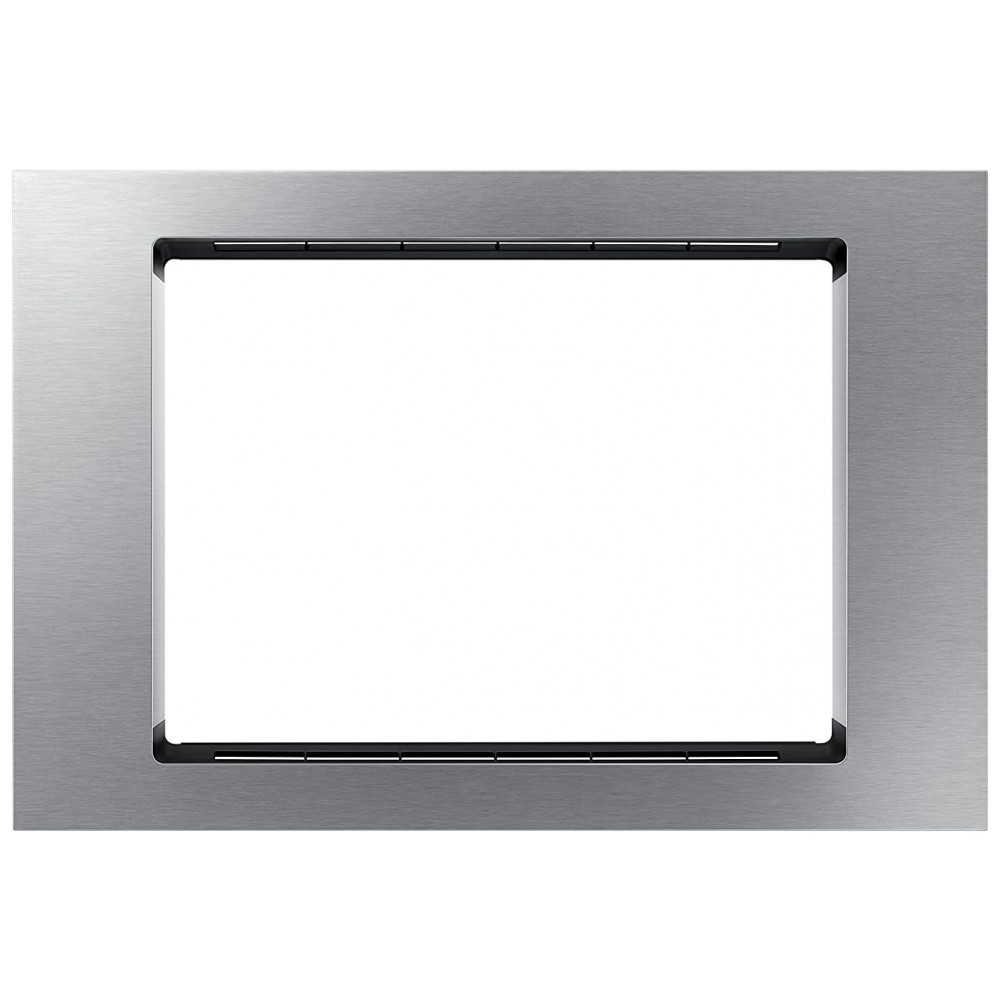 O kit de moldura para micro-ondas Samsung foi desenvolvido para instalação embutida de micro-ondas de convecção de bancada compatíveis, proporcionando acabamento frontal em inox alinhado ao móvel e aos demais eletrodomésticos. A peça metálica envolve o micro-ondas instalado em nicho de aproximadamente 30 polegadas de largura, ocultando folgas laterais e superiores do recorte do gabinete.