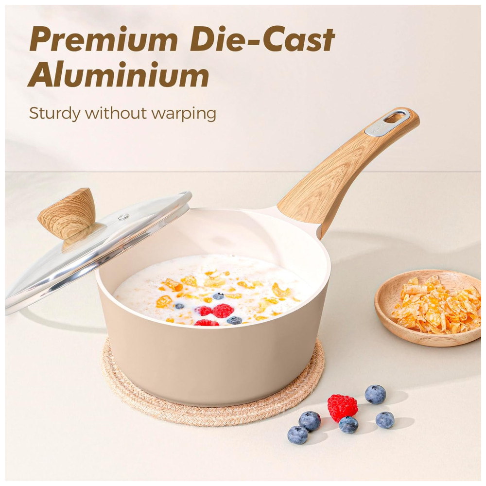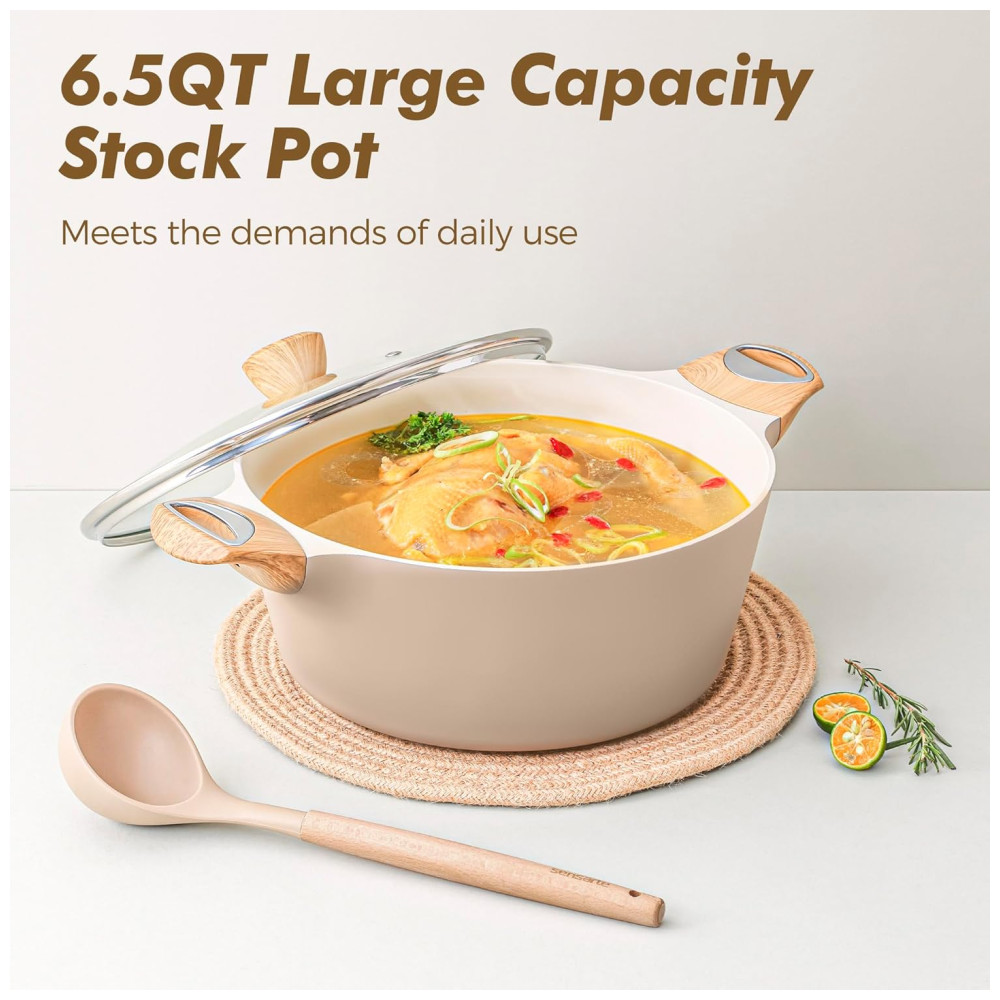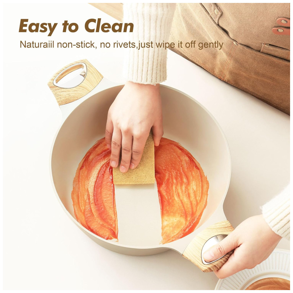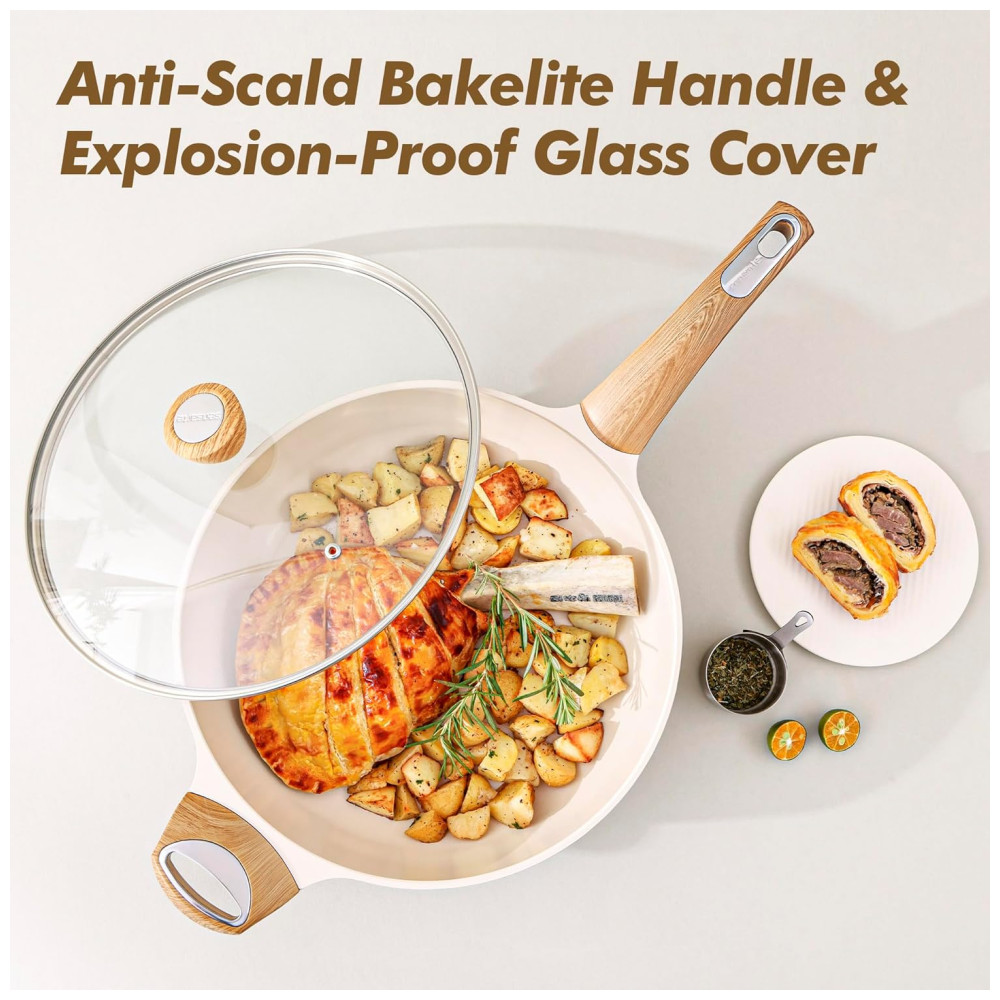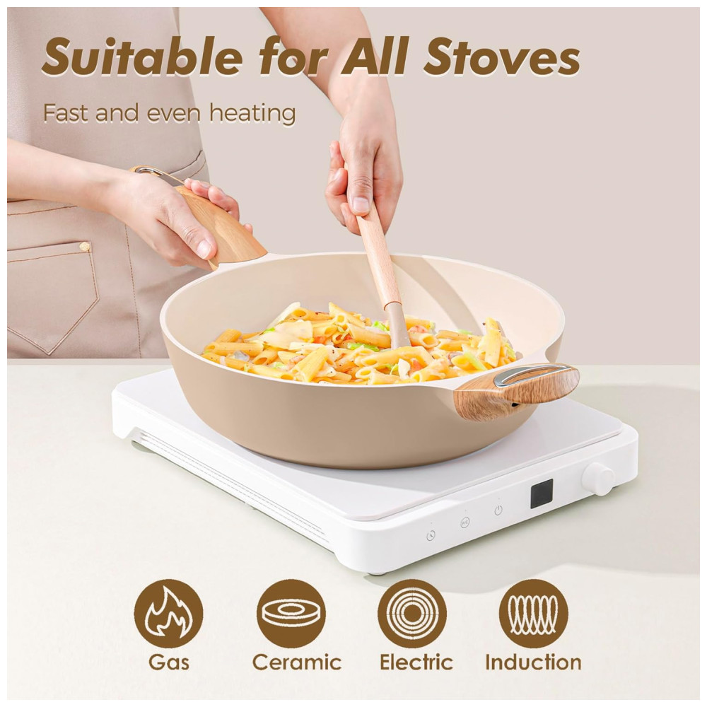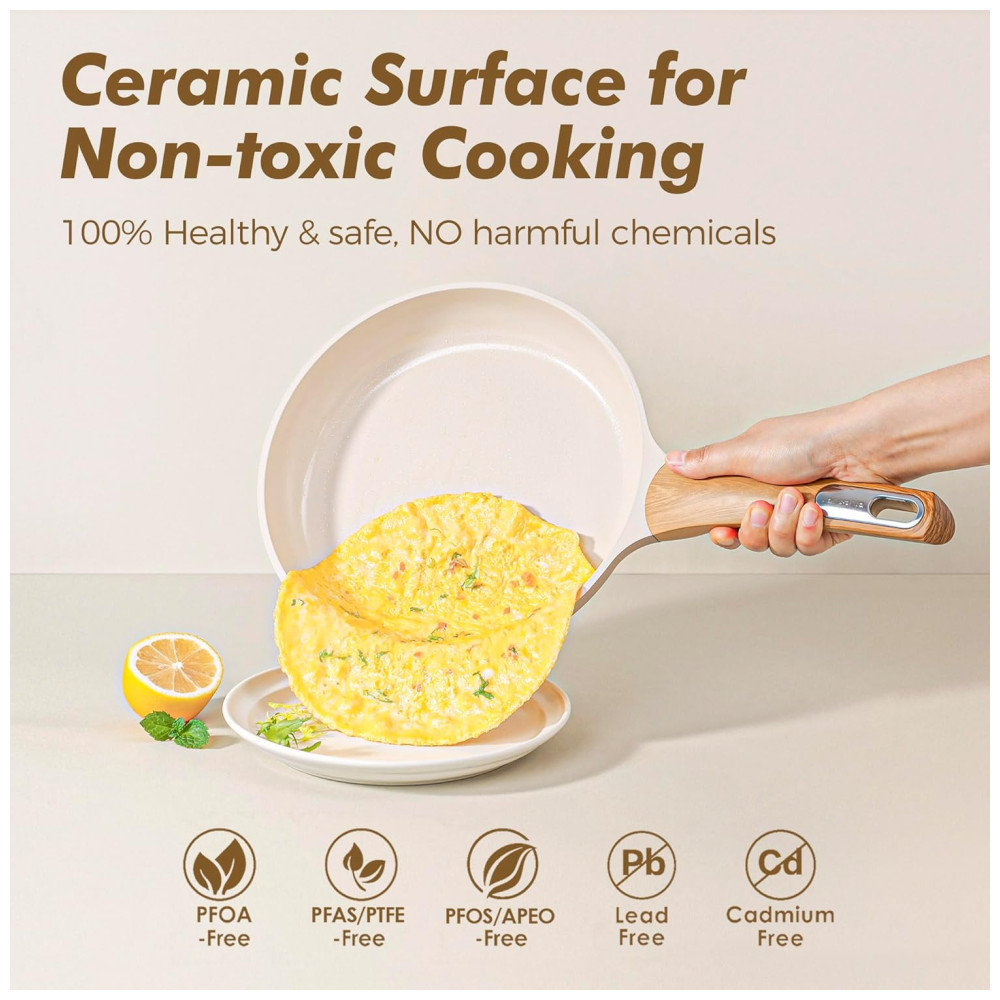 O Conjunto de Panelas e Frigideiras SENSARTE Ceramic Nonstick oferece uma opção saudável e livre de substâncias tóxicas como PTFE, PFAS, PFOA, PFOS, APEO, chumbo e cádmio. Feito com cerâmica antiaderente natural, é resistente a riscos e libera os alimentos facilmente, necessitando de menos óleo para cozinhar. Composto por 14 peças, incluindo frigideiras, panela com tampa, panela de com tampa, caçarola com tampa, 2 utensílios multiuso e 4 protetores de panela. Compatível com indução e todos os tipos de fogões, possui base em aço inoxidável de 4,8 mm que garante aquecimento uniforme e durabilidade. Fácil de limpar, possui alça ergonômica anti-escaldante em Bakelite e tampa de vidro à prova de explosão. Renove sua cozinha com qualidade e saúde!
