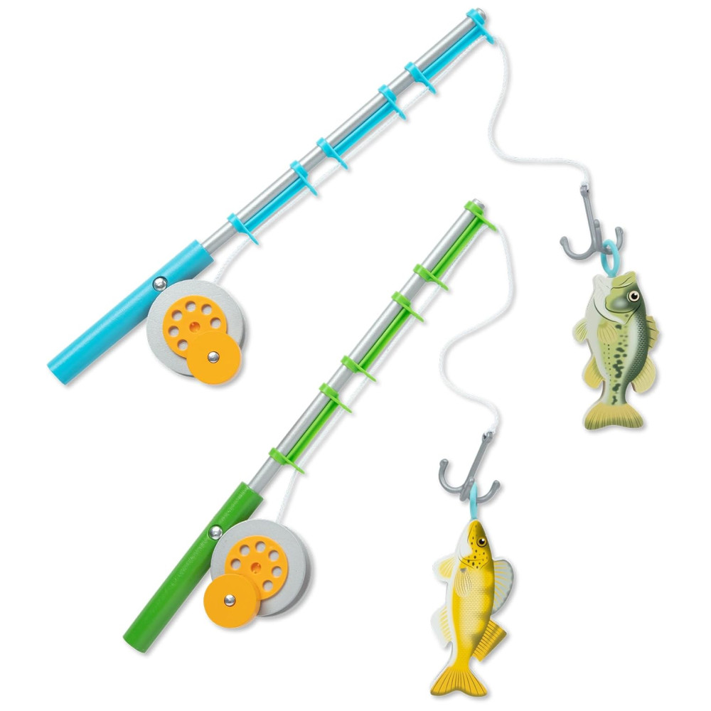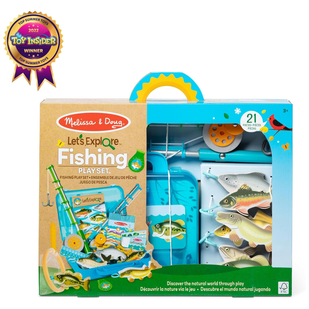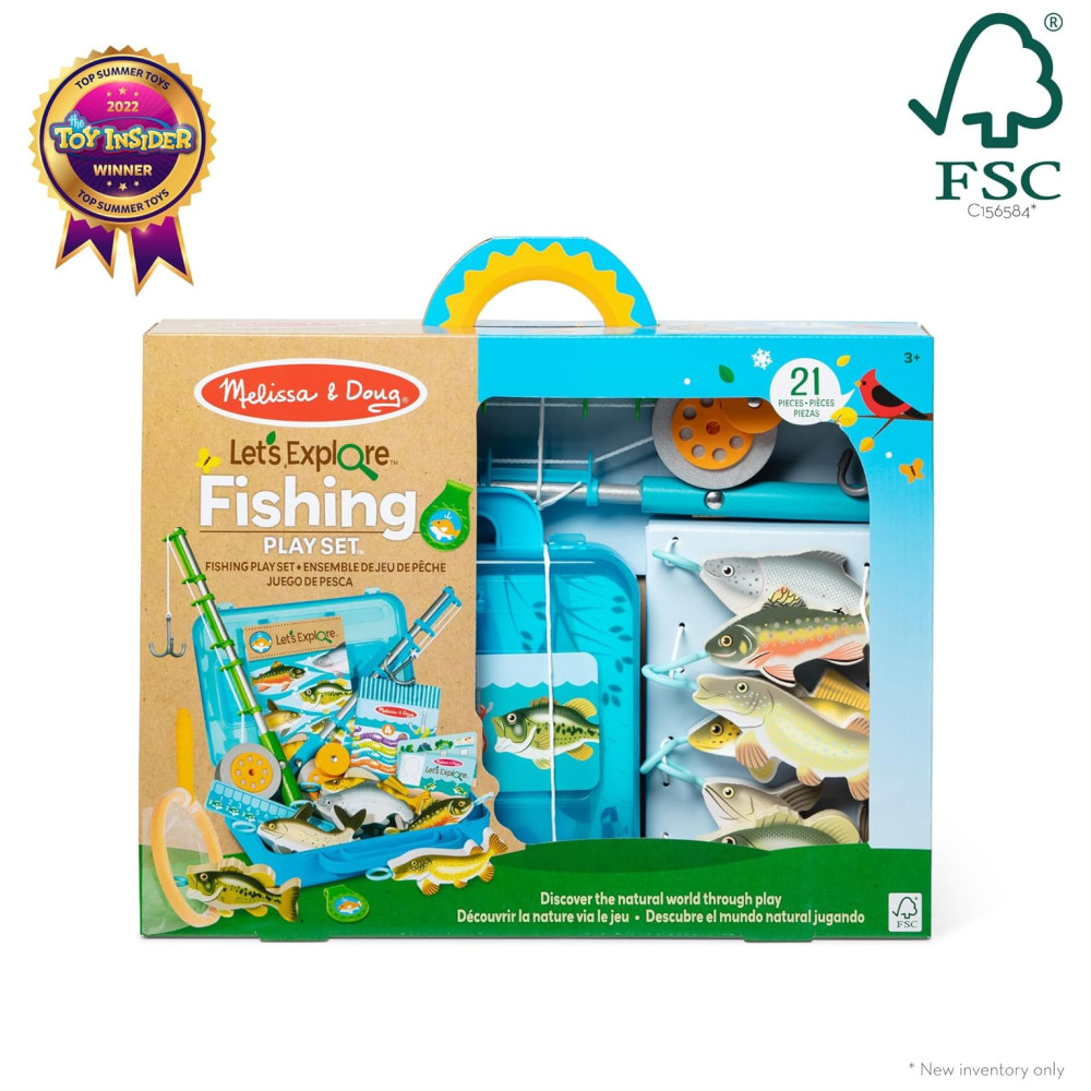 Explore a experiência de pesca ao ar livre com o conjunto Melissa Doug Lets Explore Fishing Play de 21 peças O conjunto inclui duas varas de pescar de madeira, iscas com minhocas de mentira e seis peixes de madeira para fisgar. Um tapete de jogo reversível permite que os jovens pescadores escolham uma experiência de inverno ou verão.