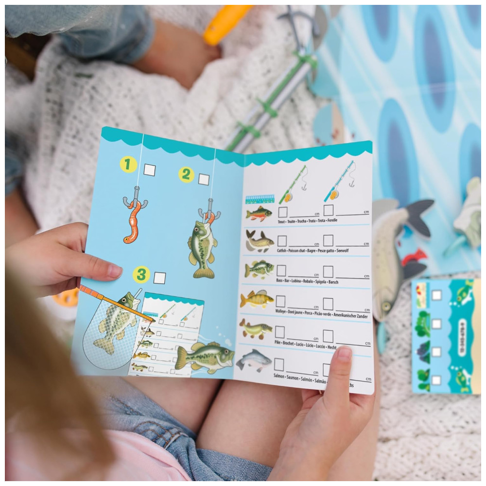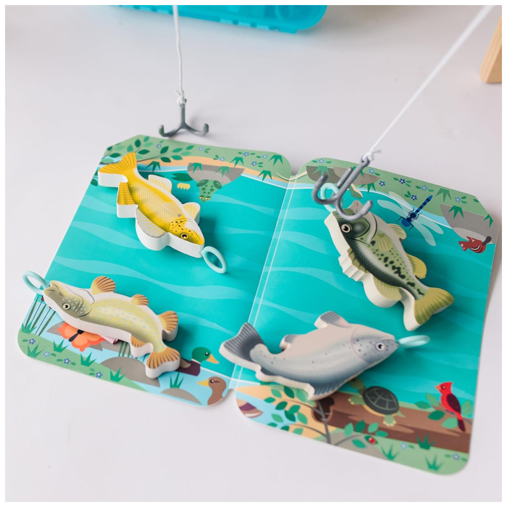O conjunto de brincadeiras de pesca de simulação de 21 peças inclui varas, iscas, peixes de madeira, caixa de equipamento e cartões de atividades. Inclui 2 varas de madeira com molinetes e anzóis seguros para crianças, 6 peixes de madeira de dupla face com laços embutidos para anzol, 4 minhocas em bolsa, rede, guia de peixes e cartões de atividades, régua para medir capturas, tapete duplo para pesca em clima quente ou frio, caixa de equipamento durável para armazenar suprimentos e medalhão colecionável.