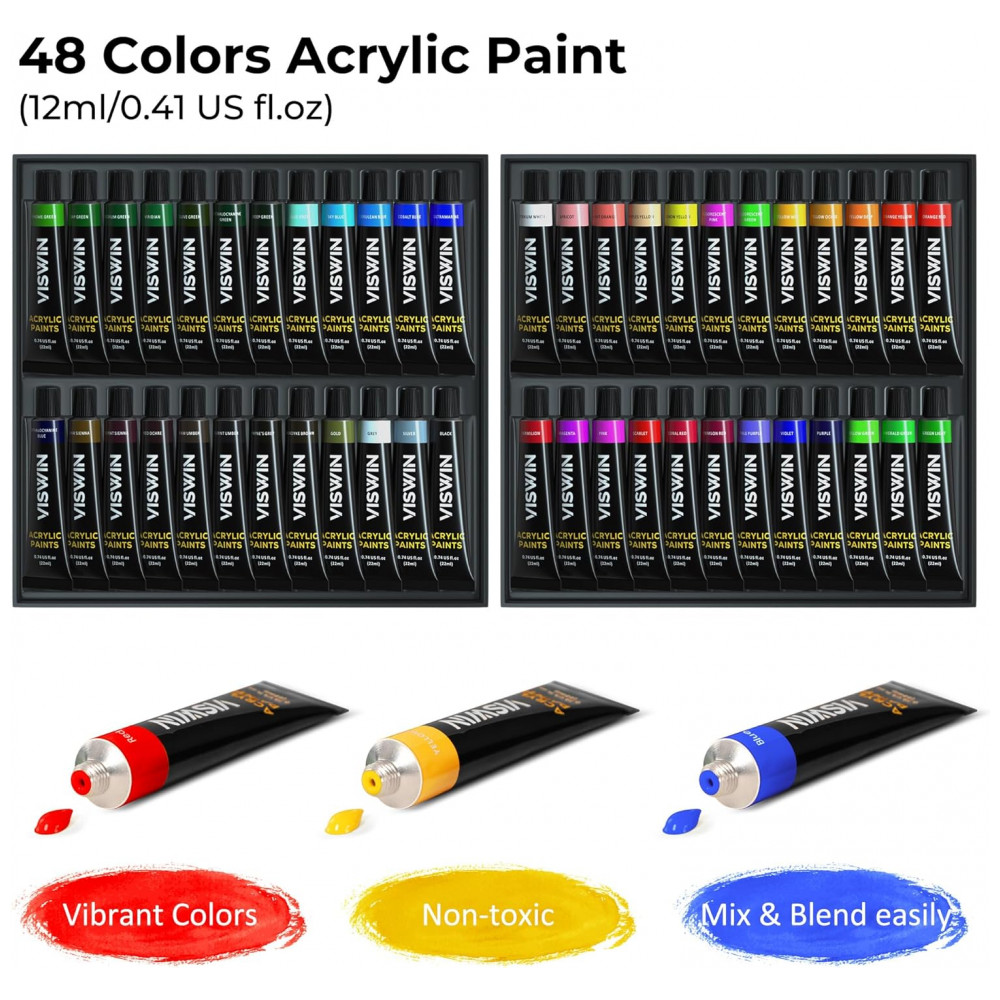 TINTAS ACRÍLICAS BRILHANTES O conjunto de tintas acrílicas de 48 cores de cores ricas e brilhantes oferece a máxima flexibilidade para suas criações artísticas. A alta concentração de pigmentos garante forte poder de cor e poder de cobertura. Eles secam mais rapidamente do que as tintas a óleo, permitem outras mídias em cima da superfície acrílica seca e podem ser s em acabamentos de alto brilho ou fosco. Use os com nossos pincéis de pintura de cabelo de nylon ou facas de paleta para mostrar seu charme