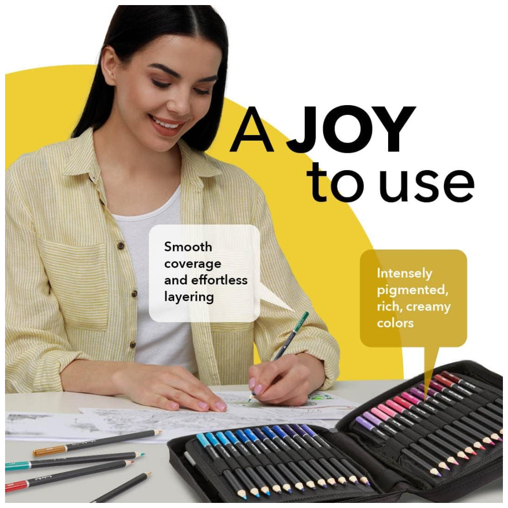 FEITO PARA FACILITAR Gama essencial de 72 lápis dispostos em famílias de cores nomeado, numerado e codificado por cores para seleção infalível basta alternar entre as camadas da capa protetora de tecido com zíper para qualquer lugar