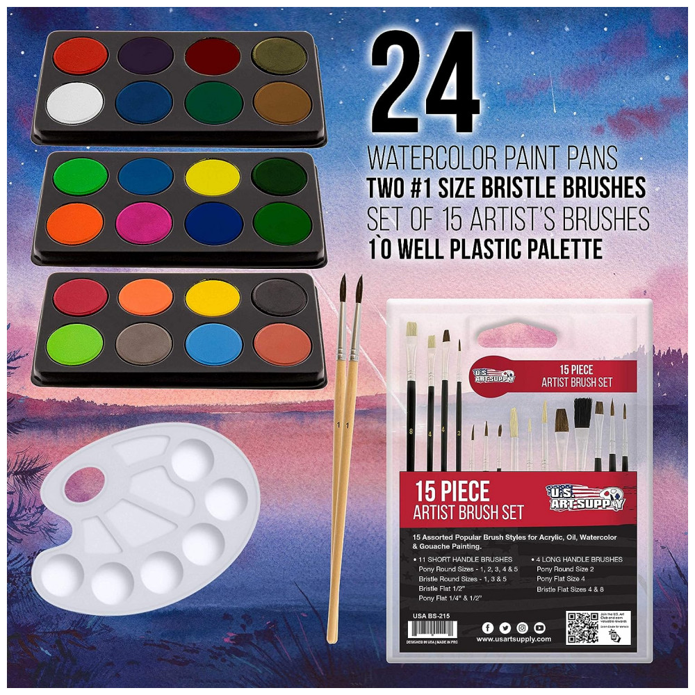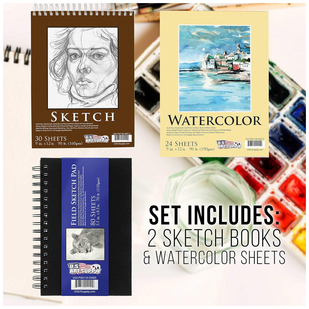 Este conjunto de criatividade exclusivo também vem com 20 peças adicionais um bloco de papel de pintura em aquarela de 24 folhas, um bloco de papel de esboço premium de 30 folhas, um caderno de esboços de campo rígido premium de 80 folhas, 15 pincéis premium, uma paleta de pintura de plástico e um roda de mistura de cores.