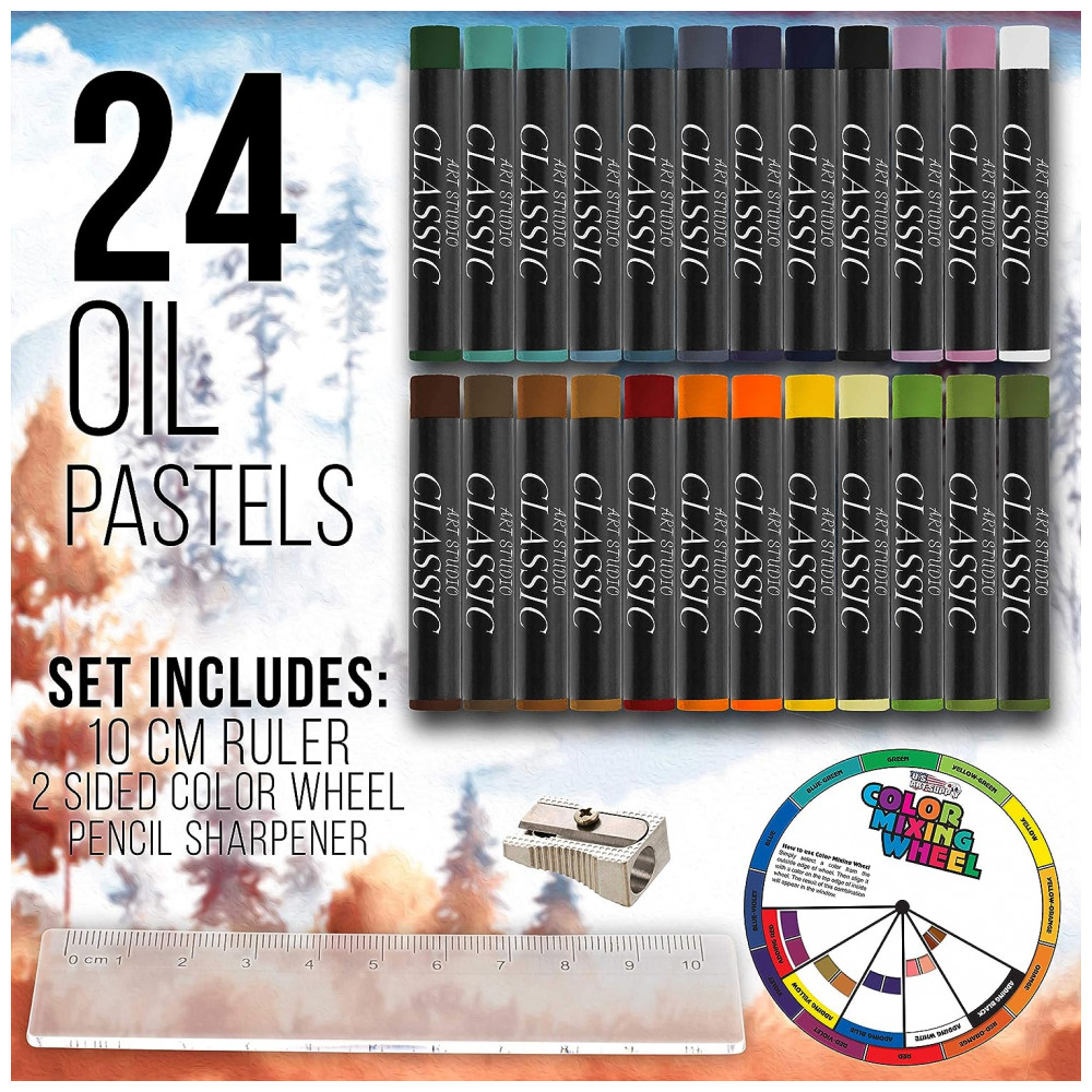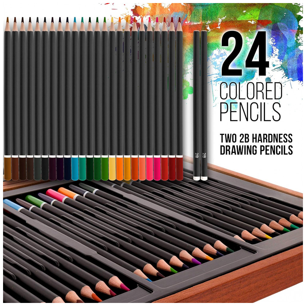 Este conjunto inclui um incrível conjunto de arte de caixa de madeira de 82 peças contendo 24 bolos de tinta aquarela de nível profissional premium, 3 bandejas de mistura, 2 pincéis, 24 cores pastel de óleo premium, 24 lápis de cor premium, 2 2B lápis de grafite, apontador de lápis, borracha e uma régua.