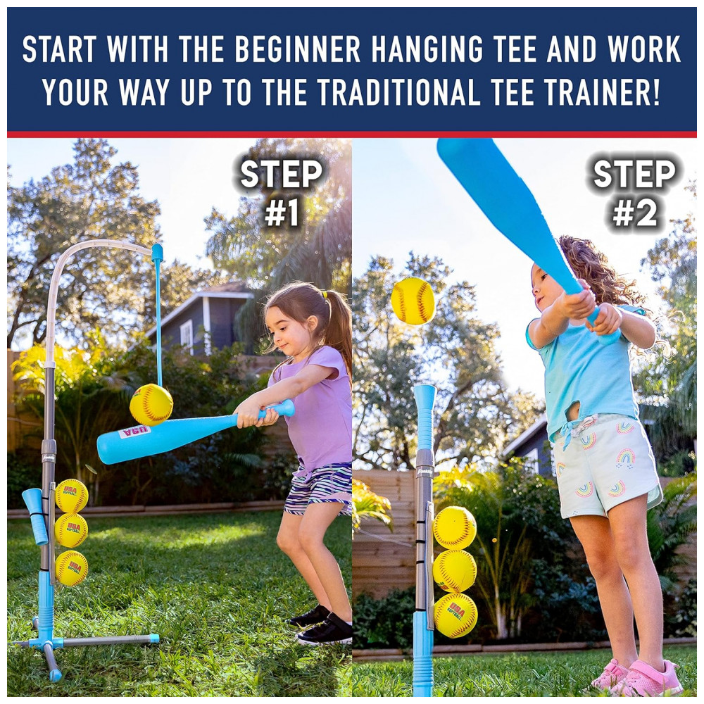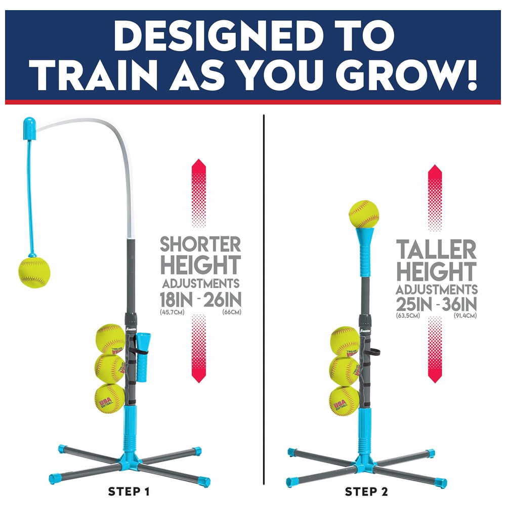 TEE DE SUSPENSÃO Para os jogadores mais jovens, o design do tee de suspensão suspende uma bola em qualquer lugar de 45 centímetros a 66 centímetros do chão usando a tecnologia de aderência automática, para que os jovens rebatedores possam praticar sua coordenação olho mão.