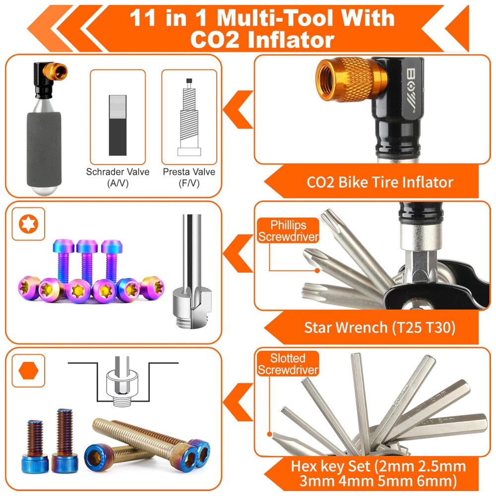 Kit de reparo de bicicleta multiferramenta 12 em 1 com adaptador de ferramenta inflador de CO2 chave Allen de 2, 2,5, 3, 4, 5, 6, , chaves estrela chave Torx tem T25, 0 e chave de fenda, chave de fenda Phillip.
