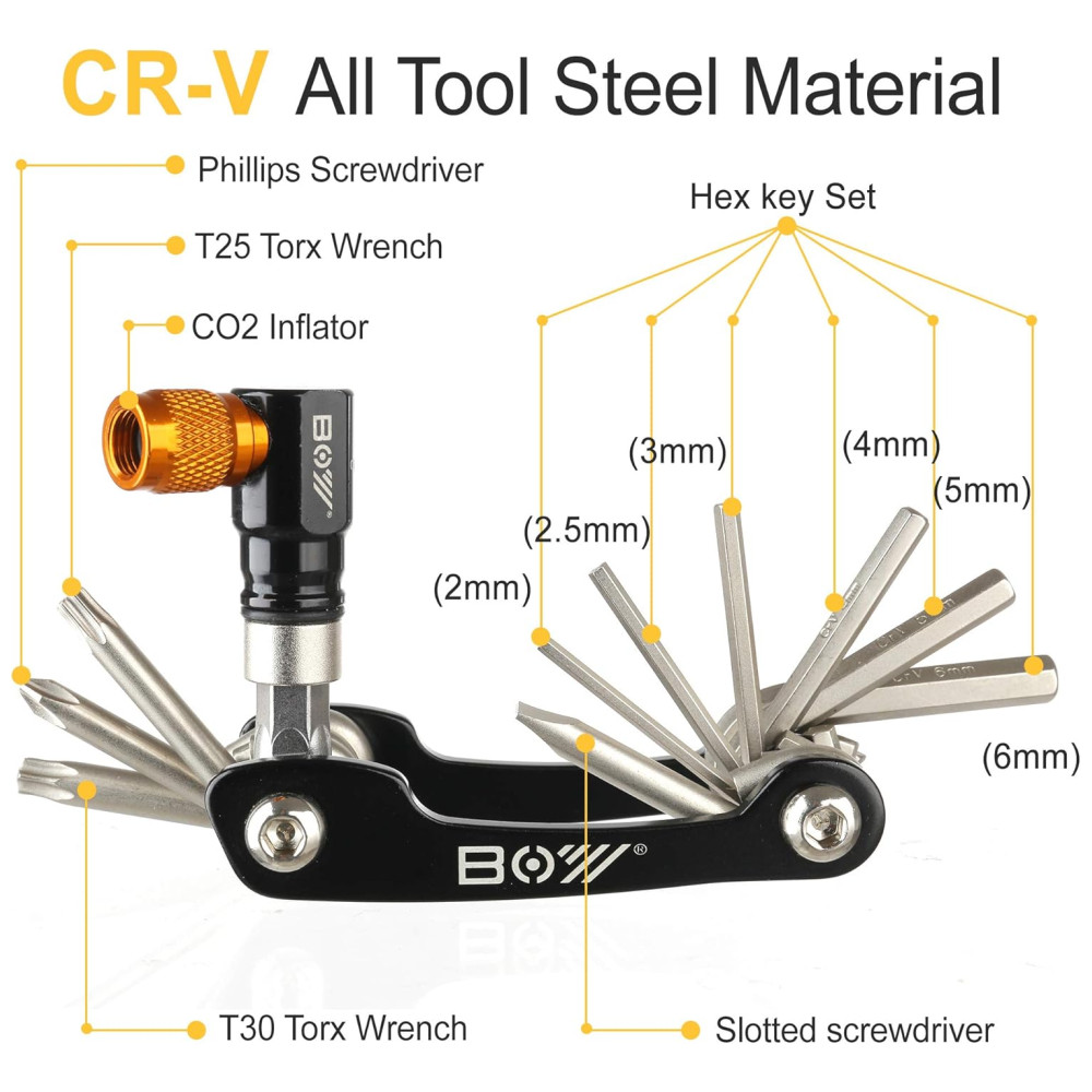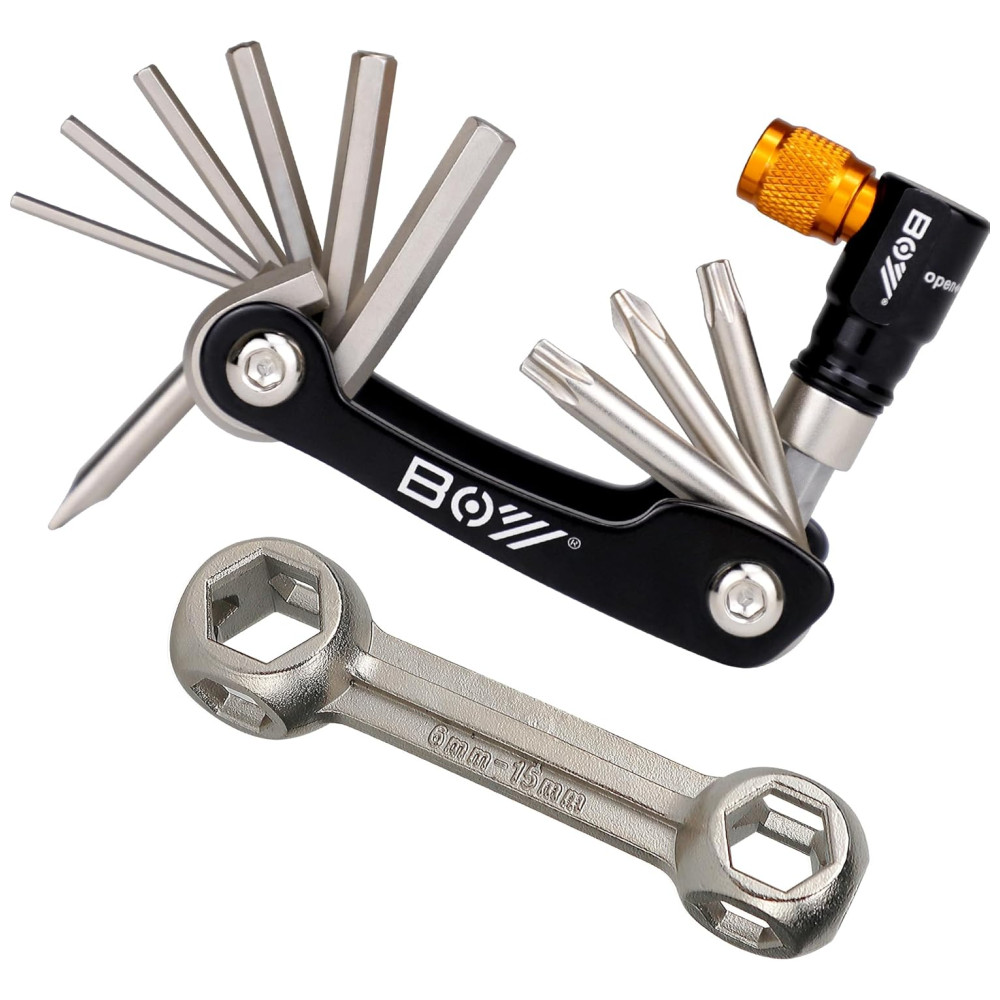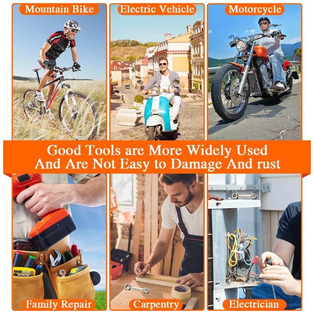 Ferramentas de bicicleta incluem chave multiferramenta e chave de osso de ferro multiferramenta para suporte diário de reparo de bicicleta, fixação, desmontagem, manutenção, etc. Muito portátil e fácil de usar, também adequado para ferramentas de reposição doméstica.