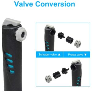 Bomba de bicicleta portátil Tamanho 8 polegadas, conveniente e pequeno. Feito de barril de liga de alumínio de alta qualidade e peças de precisão, basta desparafusar o bico no sentido anti horário manualmente ou com pequenas ferramentas para mudar a válvula Presta para a válvula Schrader.