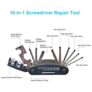 Bolsa de reparo de bicicleta Com mini bomba de bicicleta de liga de alumínio, traqueia, 2 parafusos, remendo de pneu, 3 alavancas de bicicleta de aço inoxidável, chave de osso, válvula de expansão, válvula de agulha, válvula reguladora de ar, bolsa de bicicleta preta, o Conjunto de chaves de bicicleta de alta dureza 16 em 1.