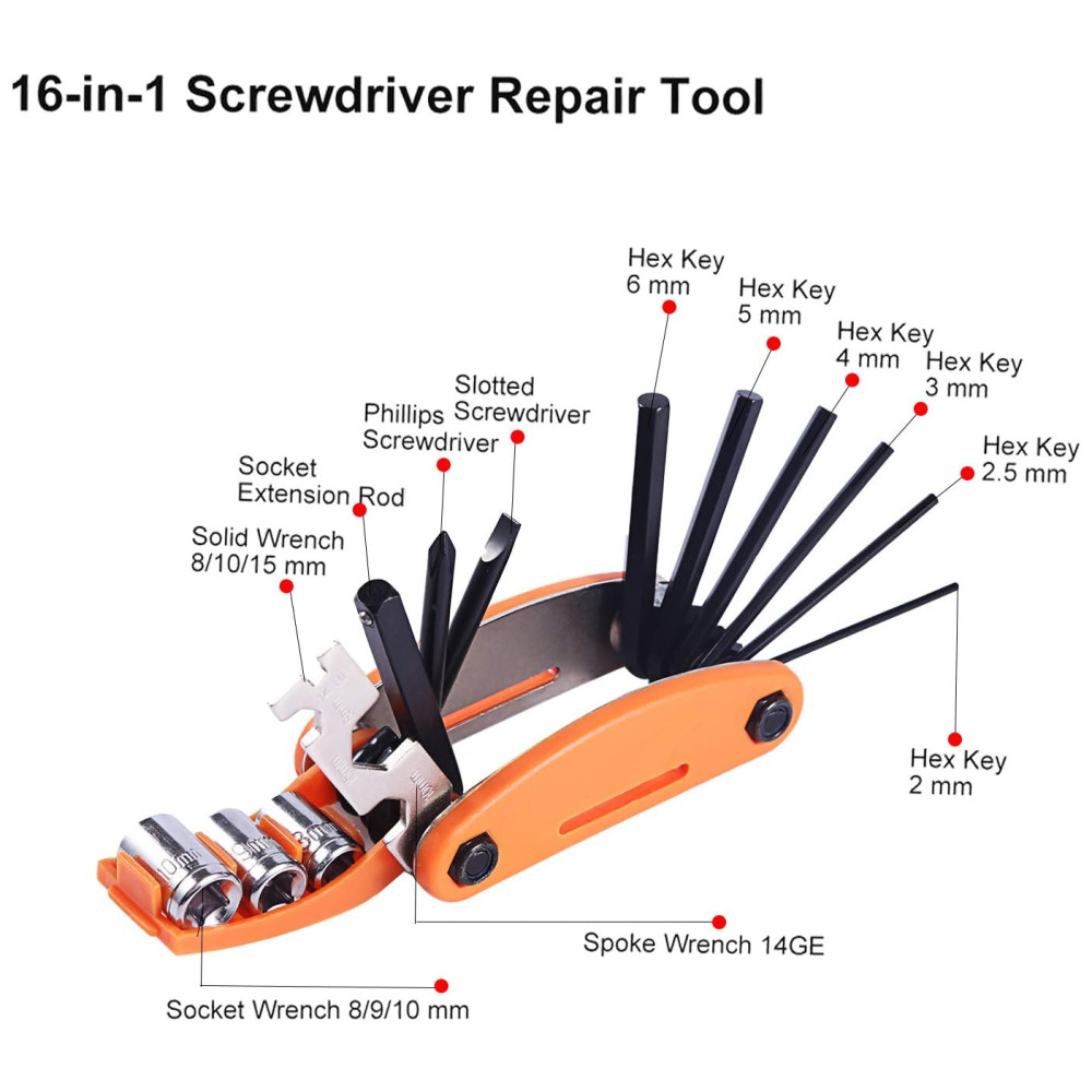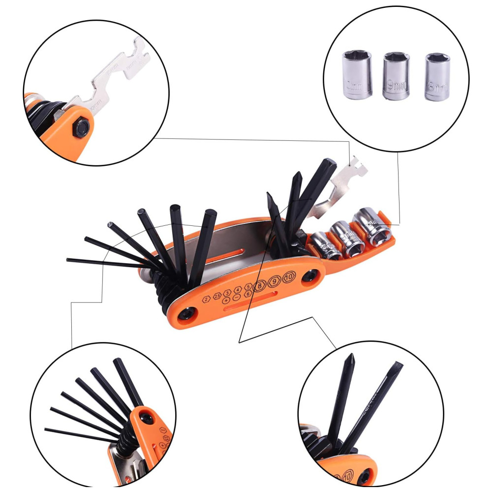 FERRAMENTA 16 EM 1 DE ALTA RESISTÊNCIA As ferramentas 16 em 1 essenciais para bicicletas têm 6 tipos de chave hexagonal interna diferente, 3 tipos de chave de soquete, 3 tipos de chave plana, 2 tipos de chave de fenda, 1 chave de raio e 1 manga haste de extensão