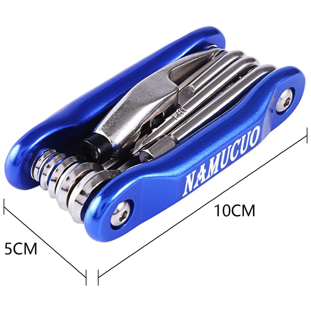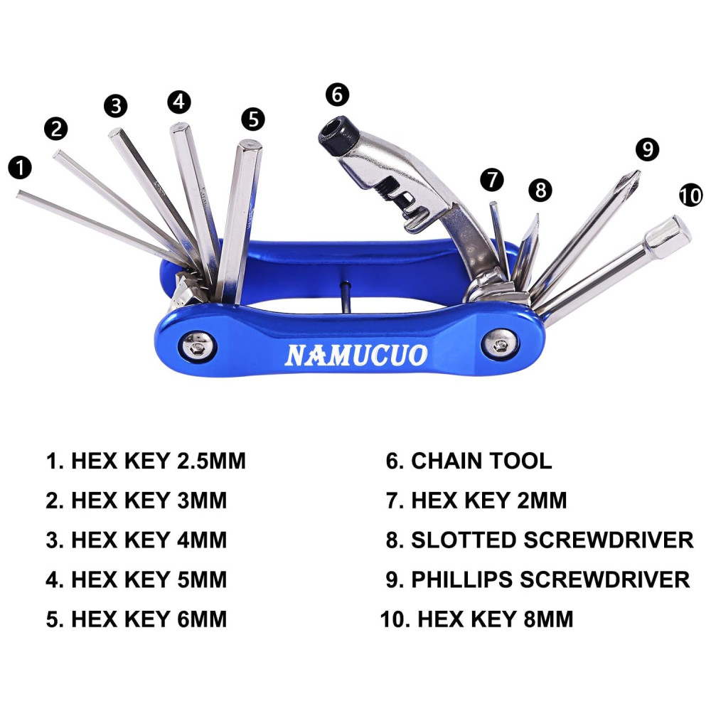 FERRAMENTA 10 EM 1 DE ALTA RESISTÊNCIA. Os kits de ferramentas de reparo de bicicletas são feitos de aço carbono de alta qualidade com versão de aço mais duro. Acabamento fino e profissional, design de moda, durável, mais forte e mais eficaz, inclui chave hexagonal universal chaves allen 2, 2,5, 3, 4, 5, 6, 8mm, chave de fenda de cabeça chata, chave de fenda Philips e separador de corrente de bicicleta gancho de corrente adicional , dedal sobressalente e chave de