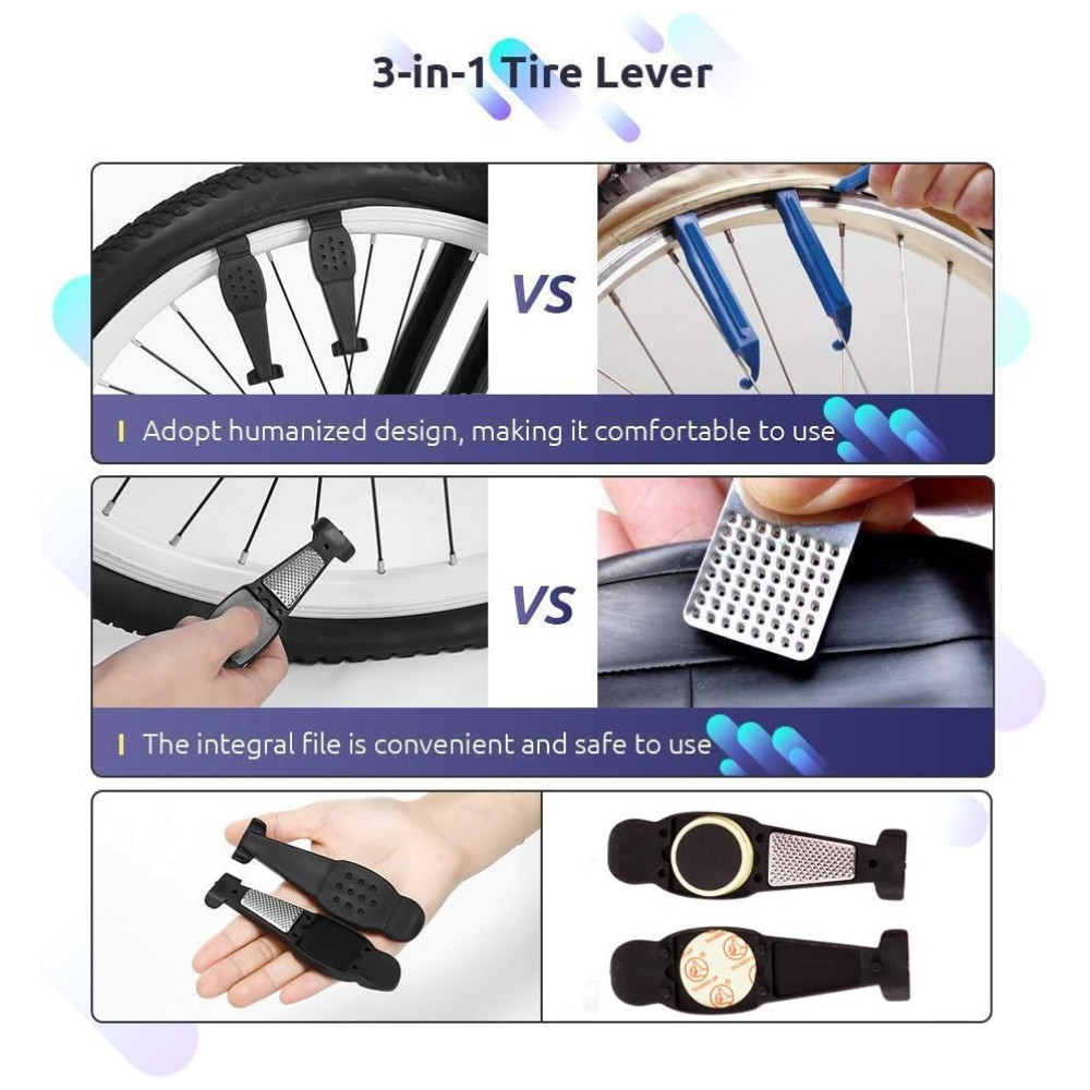 VERSÃO DE PNEUS MELHORADA 3 EM 1. Alavancas de pneus remendos pegajosos Frustração função três em um, nossos pés de cabra tipo peixe são maiores, mais resistentes e não são fáceis de quebrar, a frustração pode ser desmontada e instalada no pé de cabra mais conveniente. Pode acomodar vários remendos de pneus, pode ser desmontado e zenado quando não estiver em uso