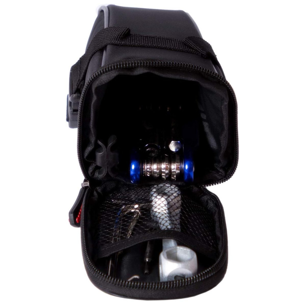BOLSA DE SELIM PORTÁTIL DEDICADA. A bolsa de cauda do assento em forma de cunha aerodinâmica com bolso principal interno e bolso de malha auxiliar, pode encher as ferramentas e pequenos itens como chaves. Sistema de montagem de liberação rápida da bolsa do assento que permite montagem e remoção rápida e fácil sem ferramentas. É compacto e fácil de transportar, e tem uma função à prova dágua