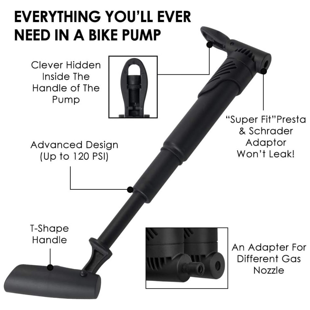 Mini bomba de inflação rápida Sistema de pressão de reforço embutido, a bomba de pressão máxima de 120 PSI permitindo bombear pneus furados com menos força. Com o adaptador de válvula sob a alavanca de trava, o inflador se encaixa na boca da válvula Schrader e Presta. E a agulha esportiva anexada também pode inflar bolas esportivas e anéis de natação, além das bicicletas e carrinhos normais de montanha e estrada.