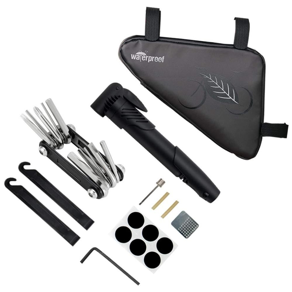 Conjunto de reparo de bicicleta essencial O kit de reparo portátil de bicicleta WOTOW inclui uma bolsa de ção de tubo superior à prova dágua, uma mini bomba de bicicleta de 120psi, uma ferramenta de chave de reparo de bicicleta multifuncional 11 em 1, algumas barras de pneu de bicicleta e remendos. Todos os acessórios podem ser guardados na bolsa de bicicleta montada debaixo do quadro, o que torna a sua condução e viagem sem problemas e com facilidade.