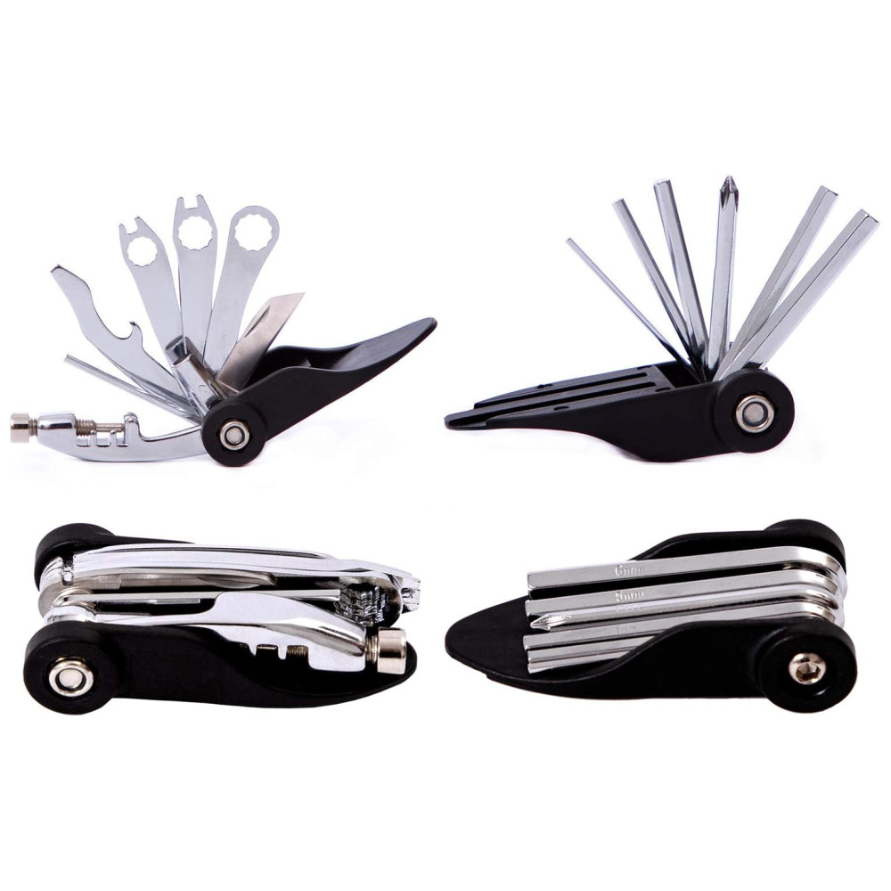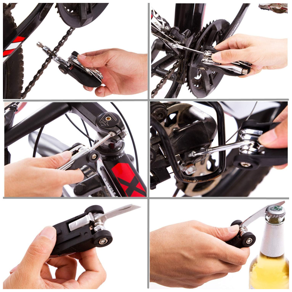 FERRAMENTA 17 EM 1 DE ALTA RESISTÊNCIA. Os kits de ferramentas de reparo de bicicletas são feitos de aço carbono de alta qualidade com versão de aço mais duro. Acabamento fino e profissional, design de moda, durável, mais forte e mais eficaz, inclui chave sextavada universal chaves Allen 2, 2.5, 3, 4, 5, 6, 8mm, chave de soquete 8,9,10, chave de fenda de cabeça chata, Chave de fenda e abridor de garrafas Philips, faca para ferramentas de emergência e ferramentas de corrente.