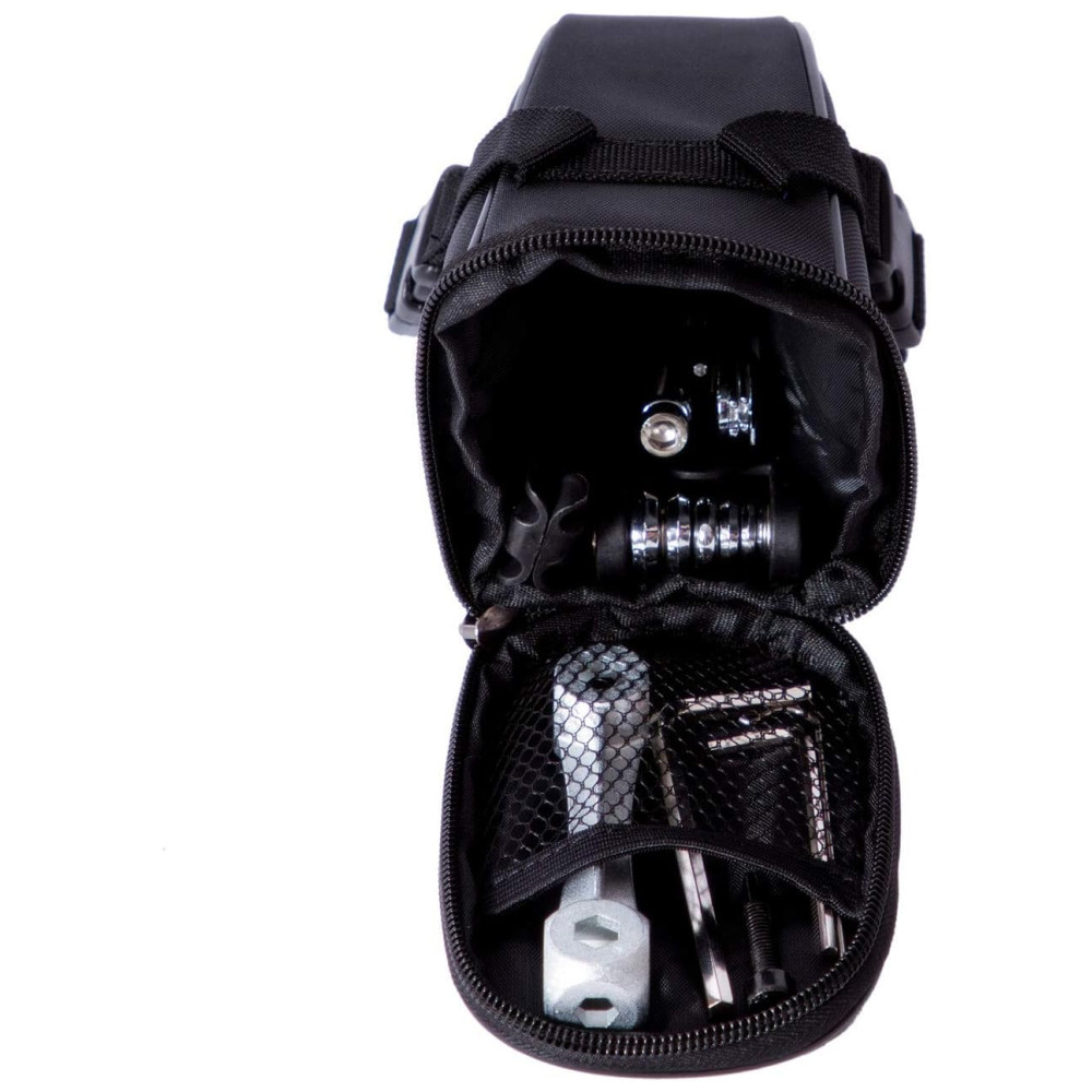 BOLSA DE SELIM PORTÁTIL DEDICADA. A bolsa de cauda do assento em forma de cunha aerodinâmica com bolso principal interno e bolso de malha auxiliar, pode encher as ferramentas e pequenos itens como chaves. Sistema de montagem de liberação rápida da bolsa do assento que permite montagem e remoção rápida e fácil sem ferramentas. É compacto e fácil de transportar, e tem uma função à prova dágua.