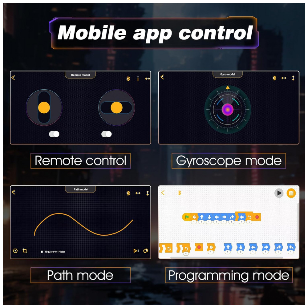 Modos no aplicativo: Modo controle remoto, modo programação, modo percurso e modo giroscópio