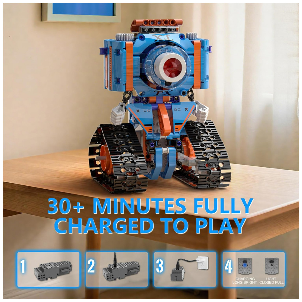 O kit de robô STEM 5 em 1 GLSQWZXD é um conjunto de construção com 337 peças que permite montar cinco modelos, incluindo robô de reconhecimento, tanque com escudo frontal tipo “leão guardião” e módulos com lançadores de baixa pressão de alta velocidade. Cada modelo possui instruções ilustradas passo a passo, facilitando a montagem manual mesmo em projetos mais detalhados. O módulo motorizado é controlado por controle remoto ou aplicativo via bluetooth, oferecendo movimentos omnidirecionais e diferentes modos de operação. O app disponibiliza modos de direção, percurso, sensor de gravidade e programação por blocos, permitindo criar sequências de comandos simples para o robô.