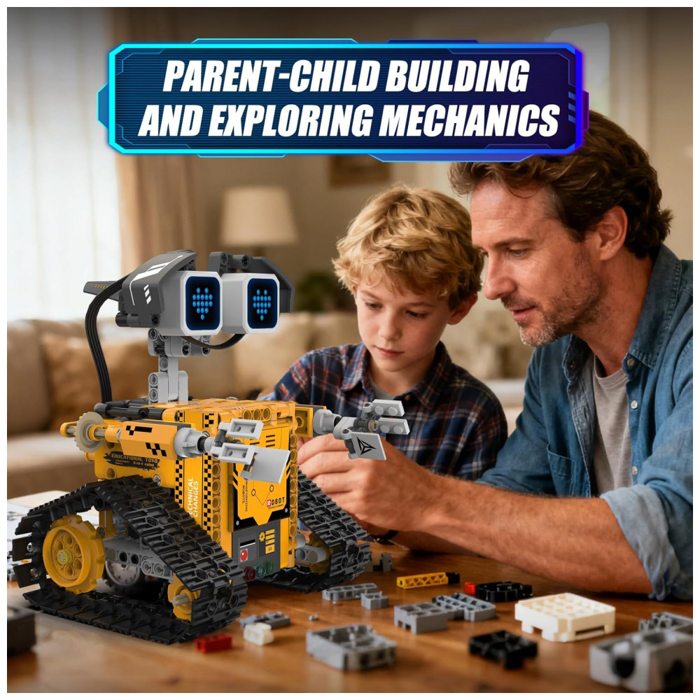 Este brinquedo trabalha principalmente conteúdos de engenharia e tecnologia, ao unir blocos estruturais, mecanismos simples e articulações em um robô móvel. A necessidade de interpretar esquemas, entender proporções visuais e testar a estabilidade da montagem aproxima a criança de conceitos práticos de matemática e ciência dentro do contexto STEM.