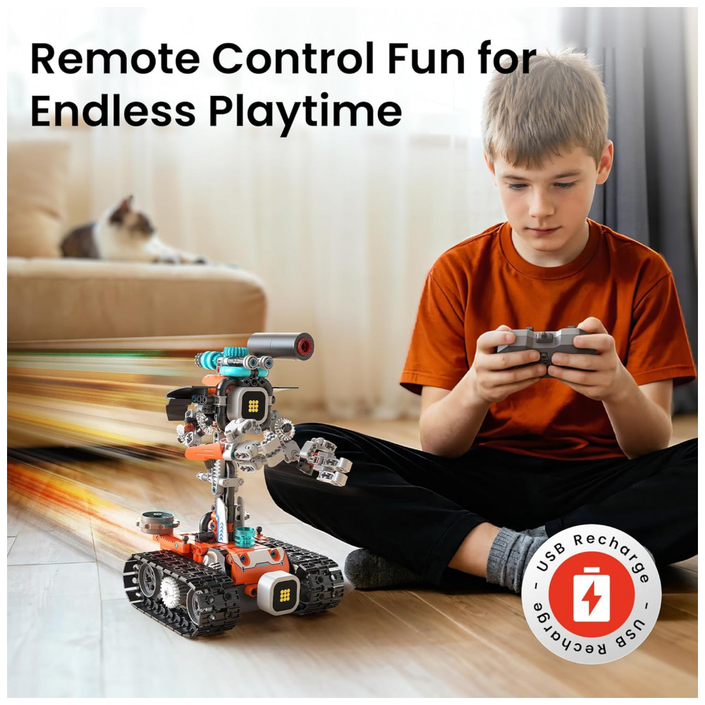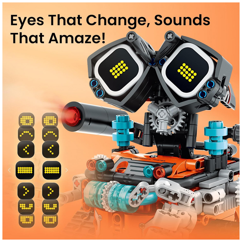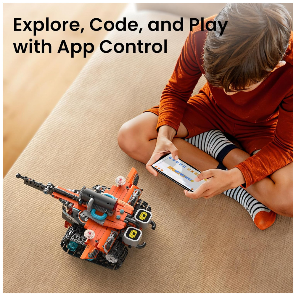 O robô principal possui olhos em LED que exibem diferentes expressões, efeitos sonoros e função de névoa ativada com pequena quantidade de água, aumentando os recursos visuais e interativos. O sistema compatível com aplicativo permite modos de direção direta e programação básica por blocos, introduzindo conceitos iniciais de lógica de comandos e sequências. Uma bateria recarregável interna alimenta o robô, reduzindo a necessidade de troca frequente de pilhas durante o uso.