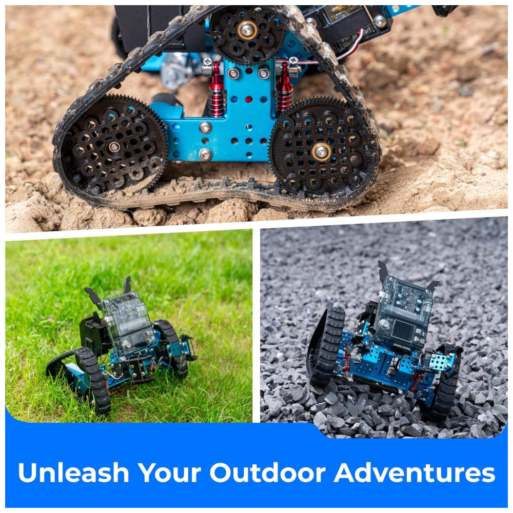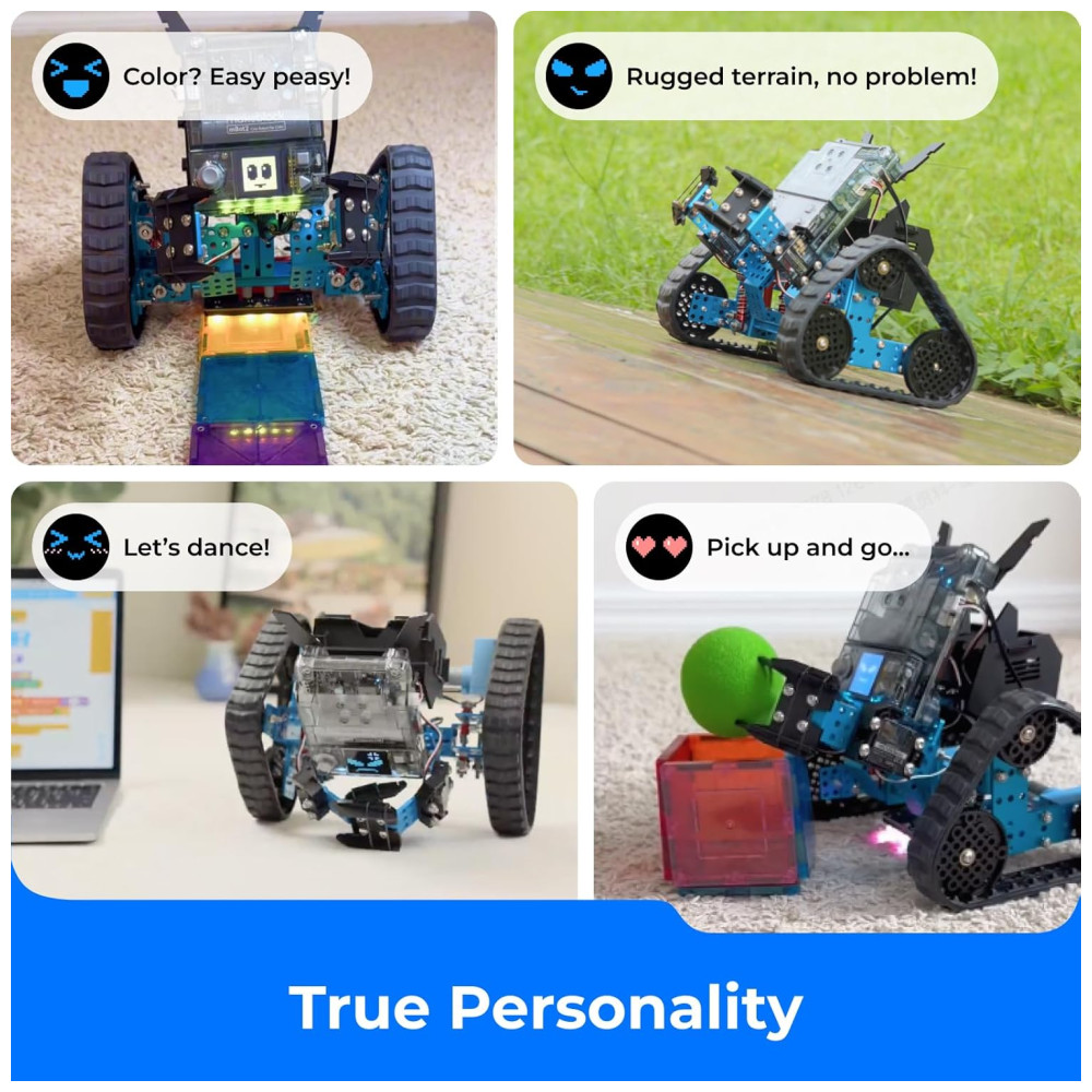 A plataforma de codificação compatível inclui Scratch (programação com blocos) e Arduino (texto), tornando o ensino acessível para todos os níveis. O kit oferece sensores integrados – ultrassom para detecção de distância, sensor seguidor de linha para navegação, sensor de luz, sensor de som e matriz de LED para interação – e motores DC equipados para movimentação precisa em diferentes direções. Suporta controle por Bluetooth, USB e por controle remoto infravermelho, além de ser compatível com diversos add-ons Makeblock.