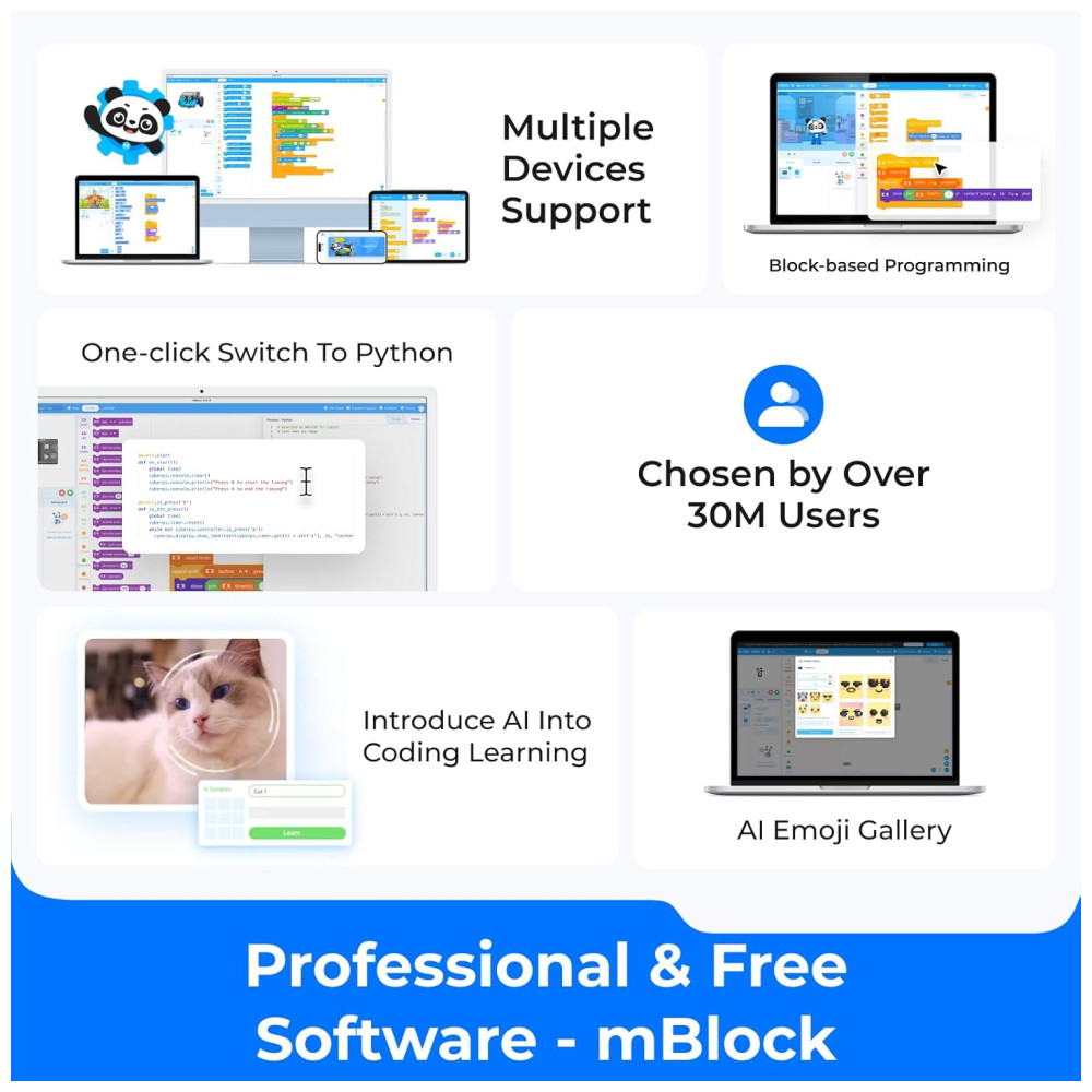 Inclui cursos e tutoriais online, promovendo o aprendizado em casa ou na escola. O mBot pode executar tarefas como evitar obstáculos, seguir caminhos, emitir luzes, sons e ser programado para múltiplos desafios, incentivando experimentação e evolução constante.