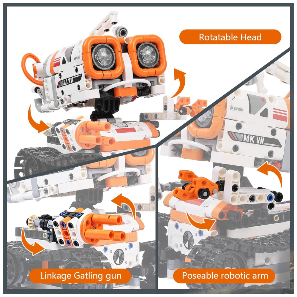 O kit de robôs combina educação STEM, construção de blocos de 560 peças, entretenimento remoto e programação de APP em um só produto, proporcionando um valor máximo para as crianças. Perfeito para aniversários, Natal, volta às aulas, etc., sendo uma escolha de presente excepcional. Com o kit, é possível criar três modelos diferentes: um robô metralhadora, um veículo blindado de esteira e um tanque de canhão mecânico. As metralhadoras de mão dos robôs podem sincronizar e girar perfeitamente com as engrenagens mecânicas, criando um efeito hipnotizante que certamente irá estimular a curiosidade das crianças! Instruções claras e passo a passo, juntamente com blocos codificados por cores, garantem um processo de montagem tranquilo. Deixe a imaginação de meninos e meninas correr solta, enquanto desenvolvem a coordenação mão-olho, lógica e concentração ao construir sua obra-prima. Desde a montagem de blocos de construção DIY até a engenharia mecânica e a codificação de robôs inteligentes, nosso produto é uma ferramenta valiosa para aprender princípios de engenharia e compreender a mecânica por trás das engrenagens. Ideal para salas de aula e atividades educacionais STEM. Construído com materiais premium de ABS, nosso produto se destaca pela durabilidade e atenção aos detalhes. Com tecnologia de 2,4GHz fornecendo suporte de controle remoto estável de longa distância, vários jogadores podem se juntar à diversão sem interferências, oferecendo uma experiência sem igual. O carregamento via Type-C atualizado proporciona ainda mais conveniência.