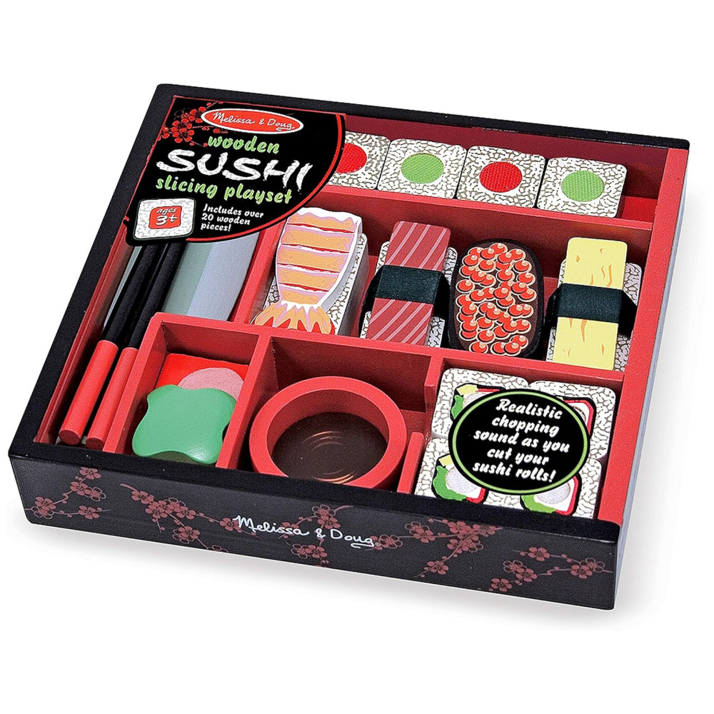 Este conjunto de sushi de madeira de 24 peças é perfeito para quem gosta de brincar de chef e se divertir com comida de mentira. O conjunto inclui rolos de sushi fatiados, camarão, atum, ovo, coberturas de ovas e arroz, além de quadradinhos de gengibre e wasabi falsos. As abas autoadesivas nos rolos de sushi emitem sons de corte realistas quando fatiados com a faca de madeira. As crianças podem facilmente pegar os pedaços de comida de madeira usando os pauzinhos autoaderentes e mergulhá los na pequena tigela.