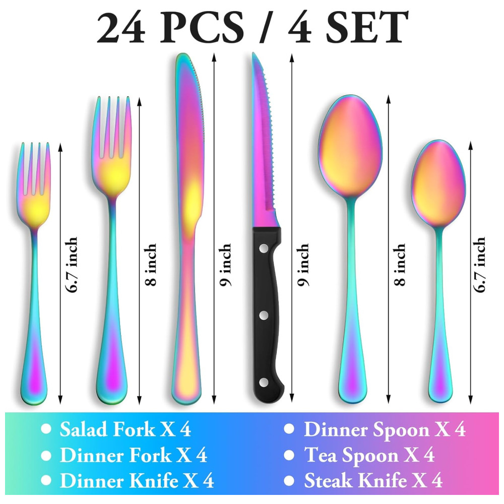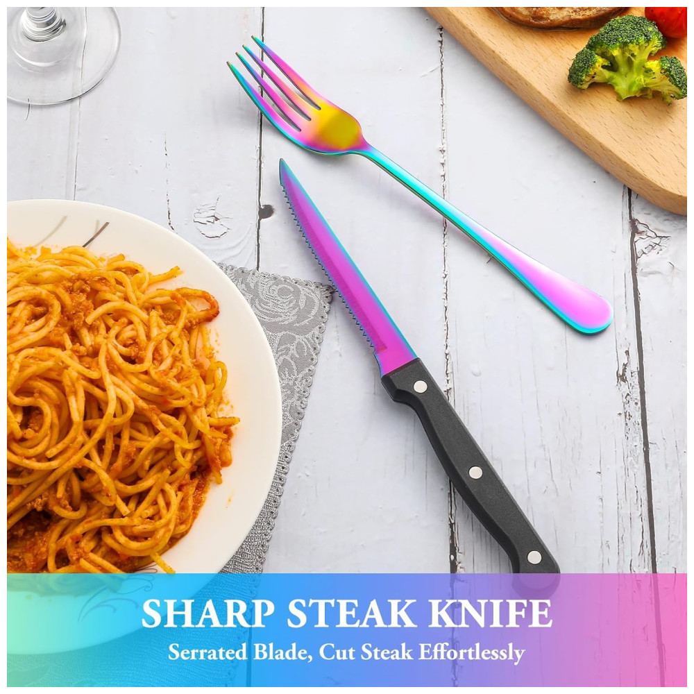 Kit de Talheres Multicoloridos com 24 Peças e Facas de Churrasco para 4 Pessoas em Aço Inox Acabamento Brilhante Utensílios de Cozinha e MesaMUTNITT
