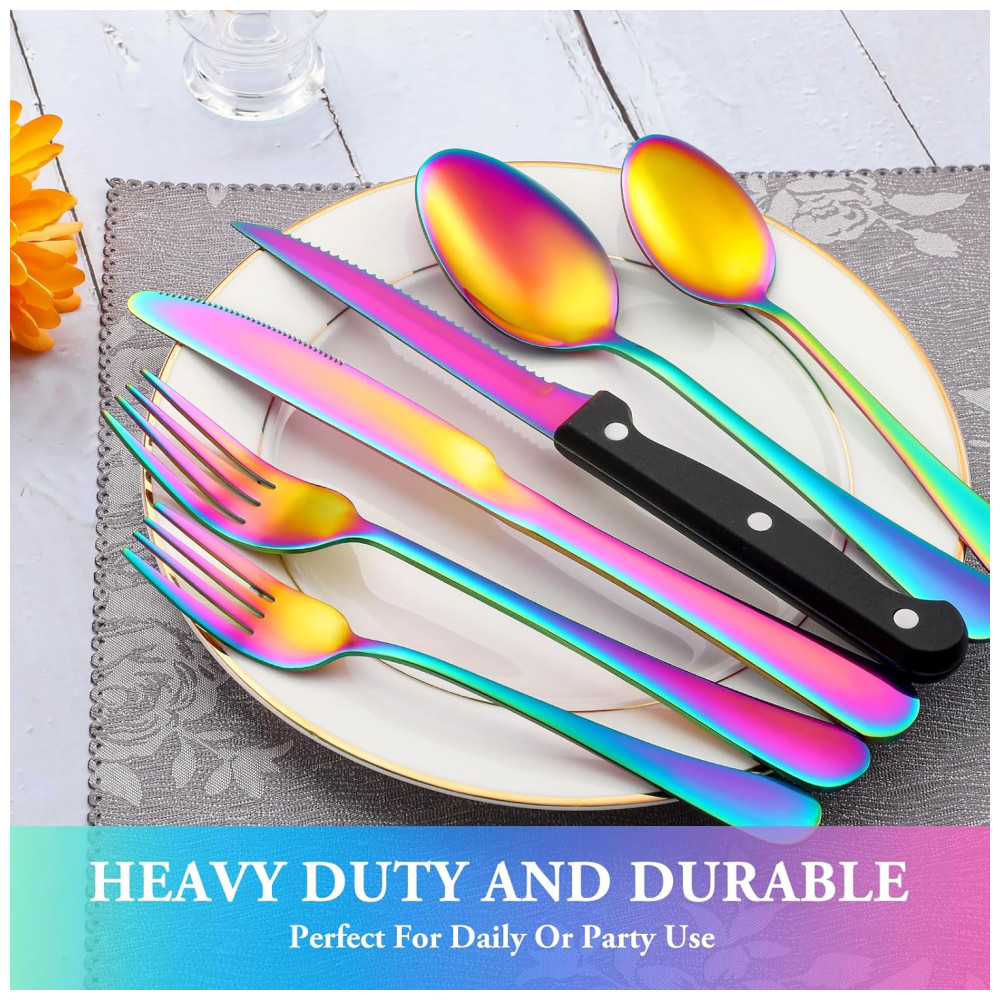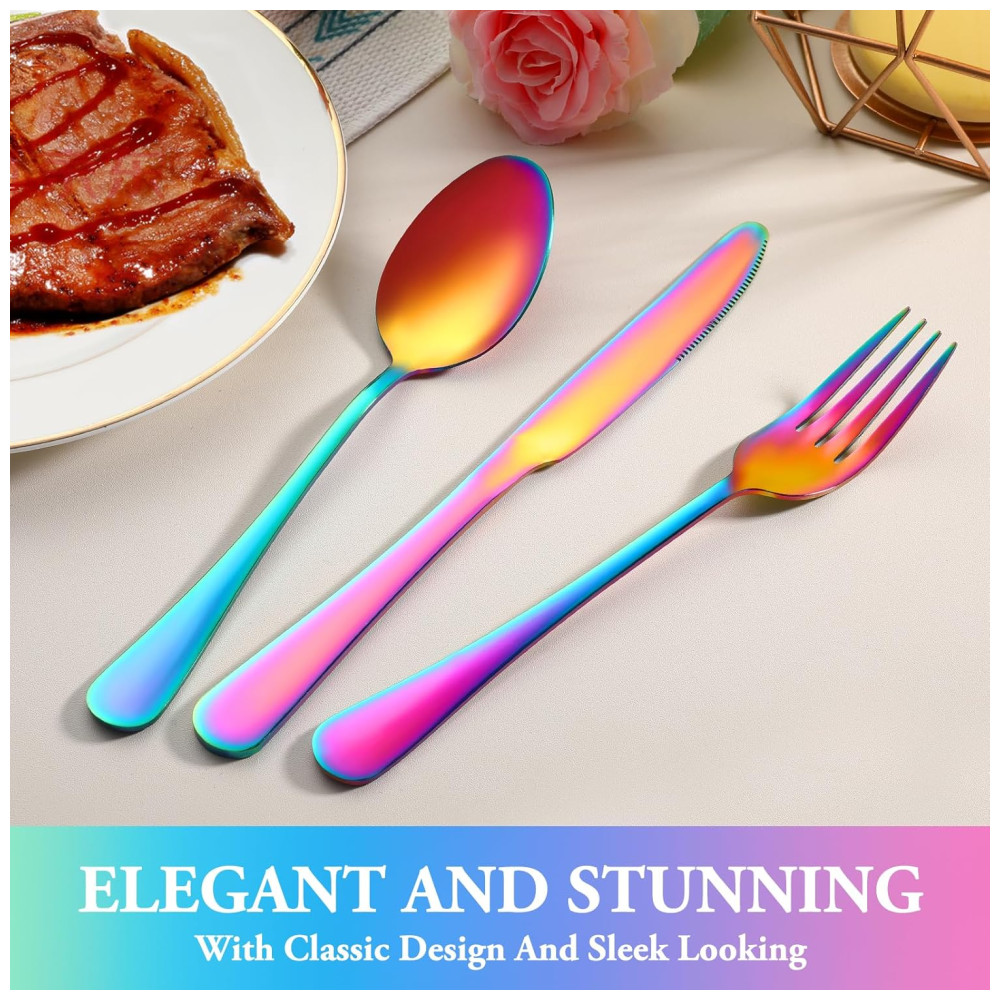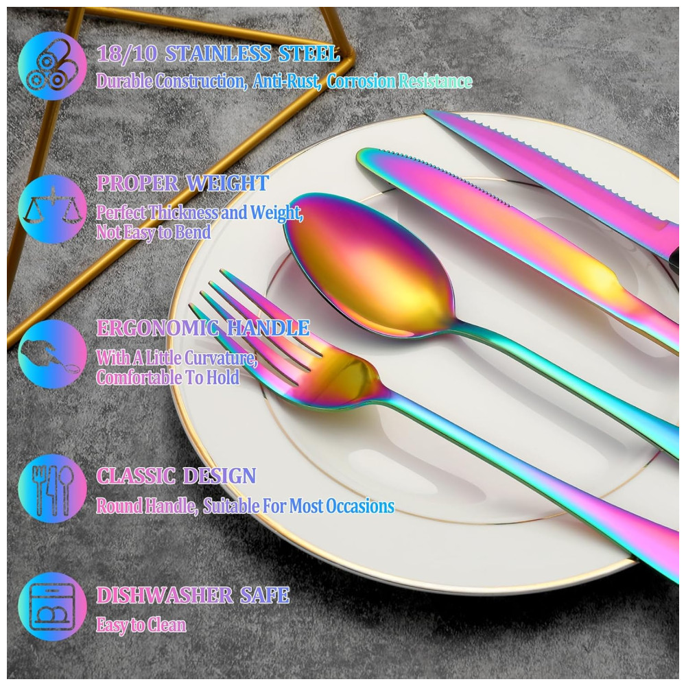Este elegante conjunto de talheres arco-íris é essencial para famílias e restaurantes, com 4 facas de jantar, 4 facas de churrasco, 4 garfos de jantar, 4 colheres de jantar, 4 garfos de salada e 4 colheres de sobremesa. Feito em aço inoxidável de alta qualidade, é durável, resistente à ferrugem, sem toxinas e não deixa gosto metálico. Seu design único em arco-íris confere um visual retro e luxuoso, ideal para jantares sofisticados. Os talheres possuem peso adequado e cabos ergonômicos para máximo conforto durante o uso, sem fadiga. Para garantir durabilidade, recomenda-se lavar à mão e secar antes de guardar. Transforme suas refeições em momentos especiais com este conjunto exclusivo.