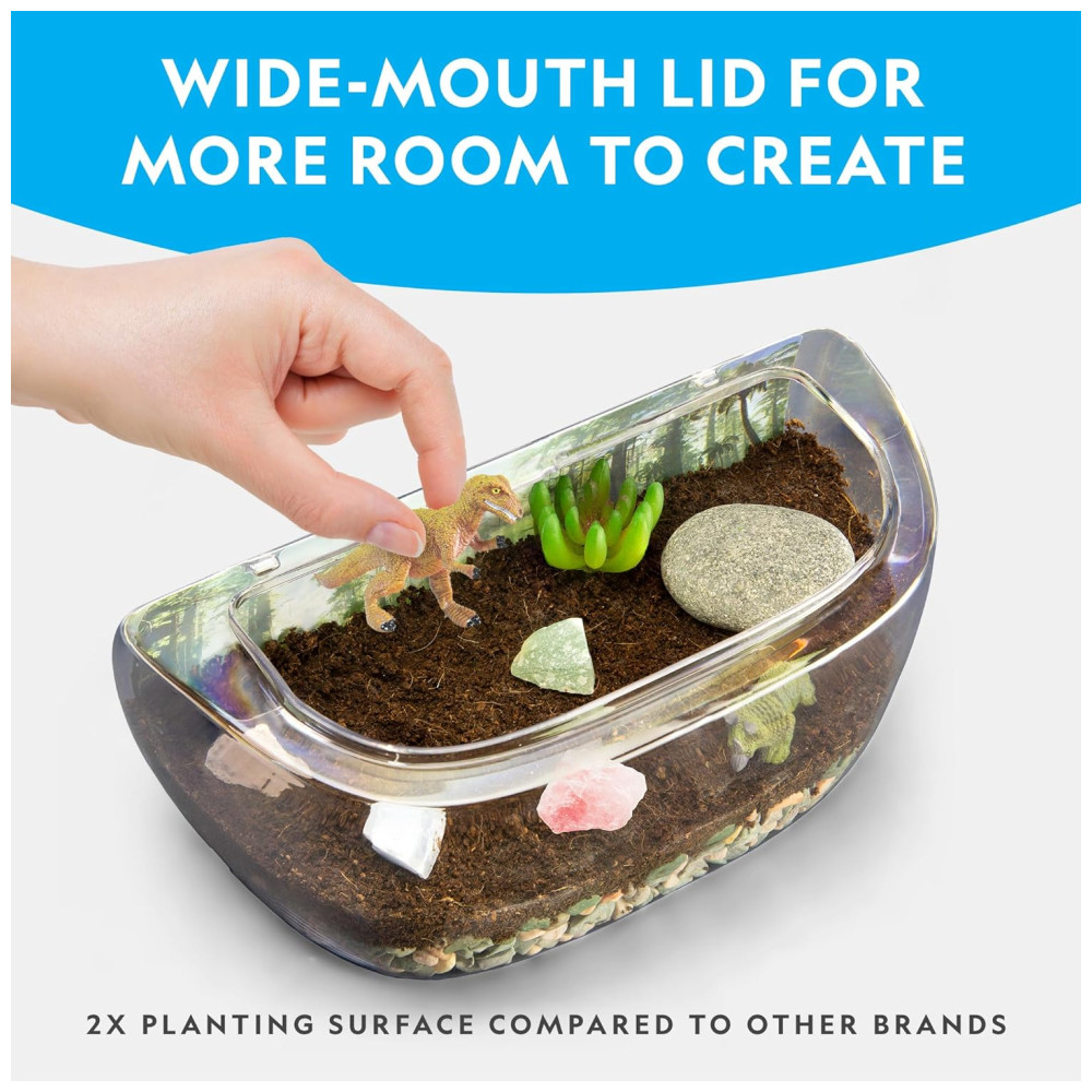 O terrário possui um design de boca larga, perfeito para mãos pequenas trabalharem com os materiais incluídos. A vista panorâmica permite explorar o interior enquanto o habitat evolui.
