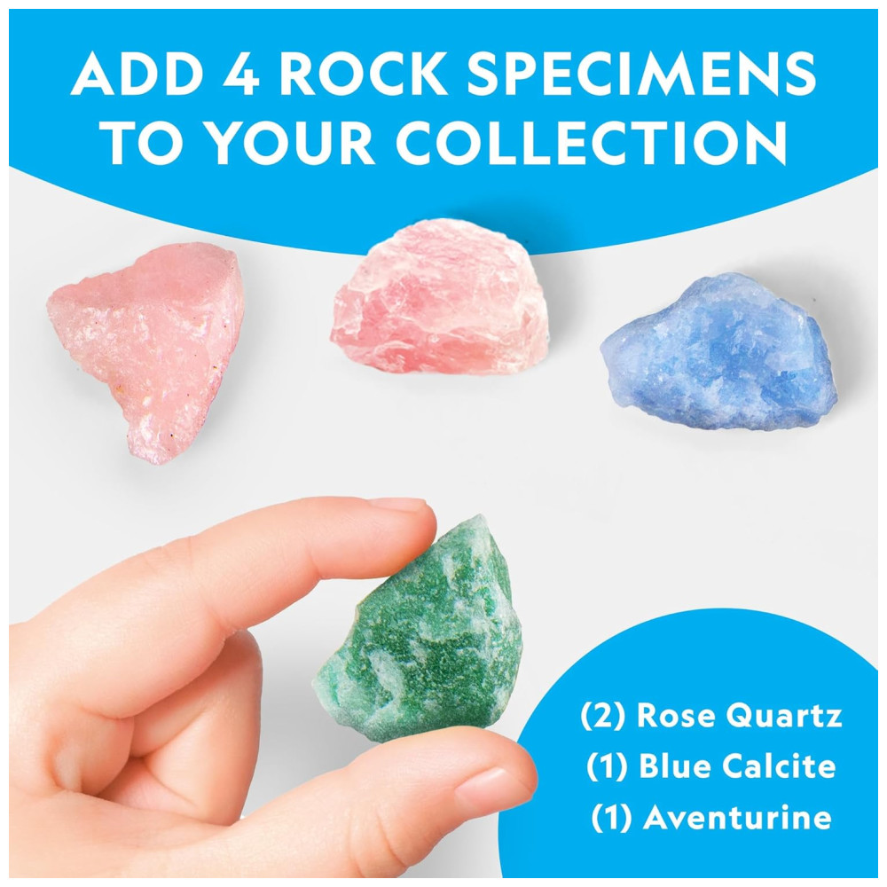 Inclui espécimes genuínos de calcita azul, quartzo rosa e aventurina, que complementam a vibração pré-histórica e dão um charme especial ao habitat.