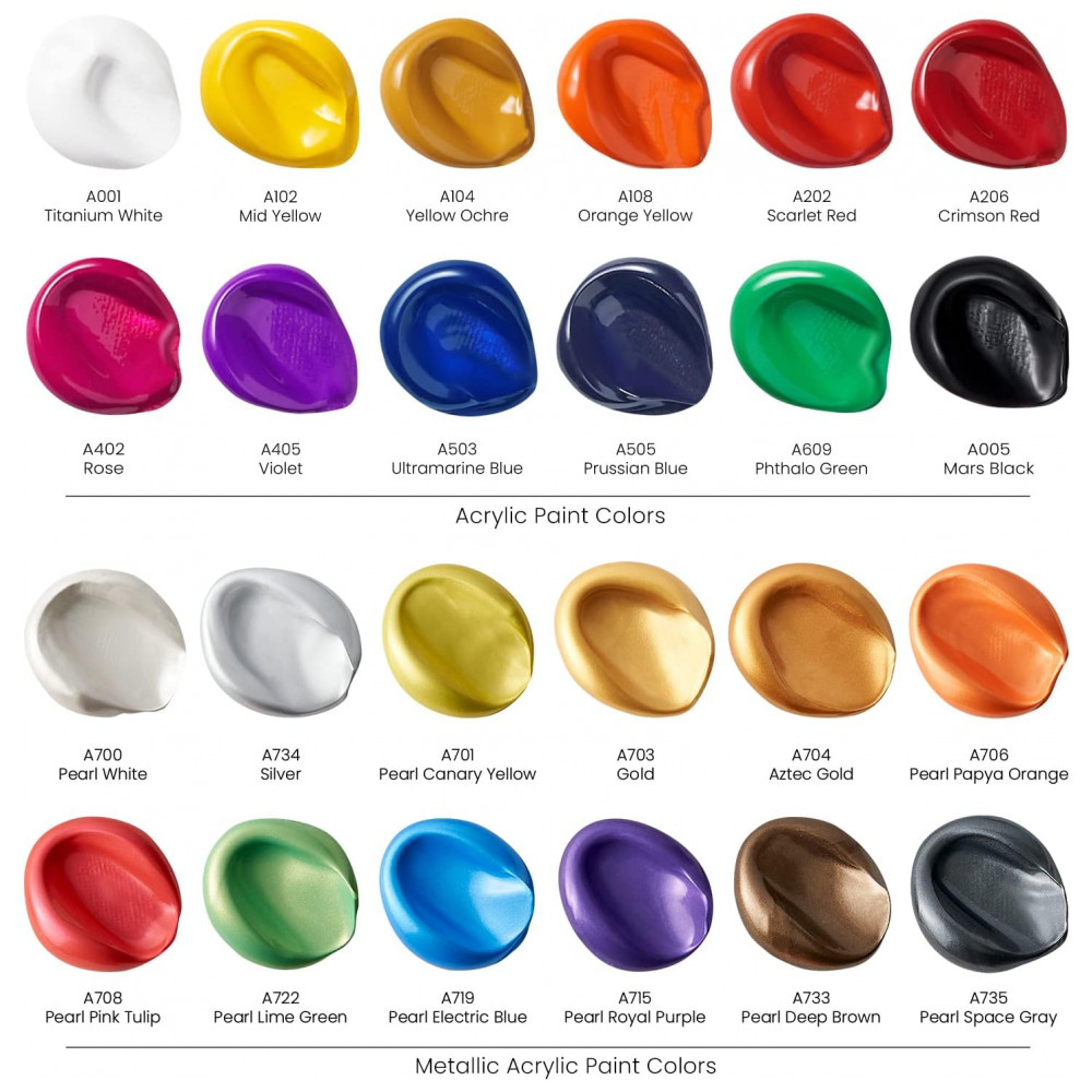 O conjunto completo de pintura acrílica projetamos este conjunto de acrílico para que os artistas tenham tudo o que precisam para começar a criar. Este conjunto de pintura acrílica inclui uma caixa de arte e ferramentas de arte, como pincéis, uma paleta de pintura e faca e 24 tintas.