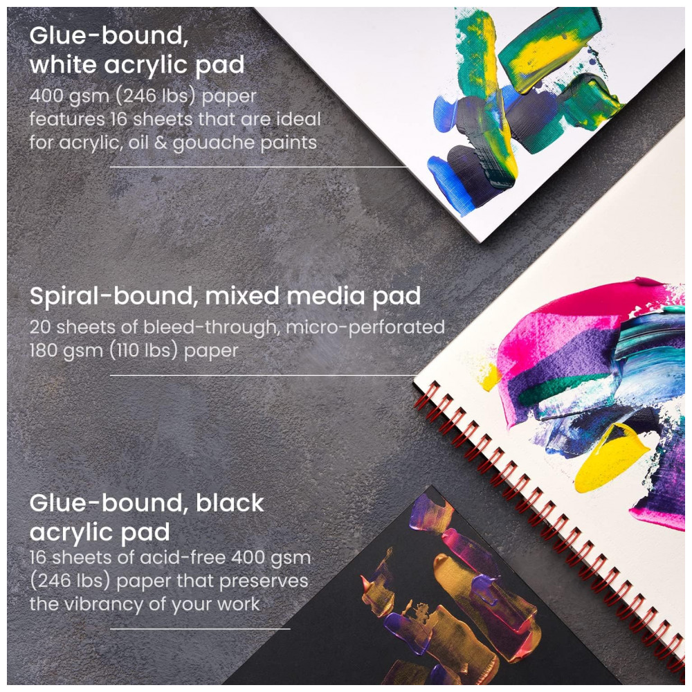 Dê o presente da arte nosso kit de pintura foi criado para o aspirante a artista visual em sua vida. Está incluído tudo o que eles precisam para começar a explorar seu ofício. Este conjunto também vem com tintas metálicas altamente pigmentadas e uma almofada de acrílico preta.
