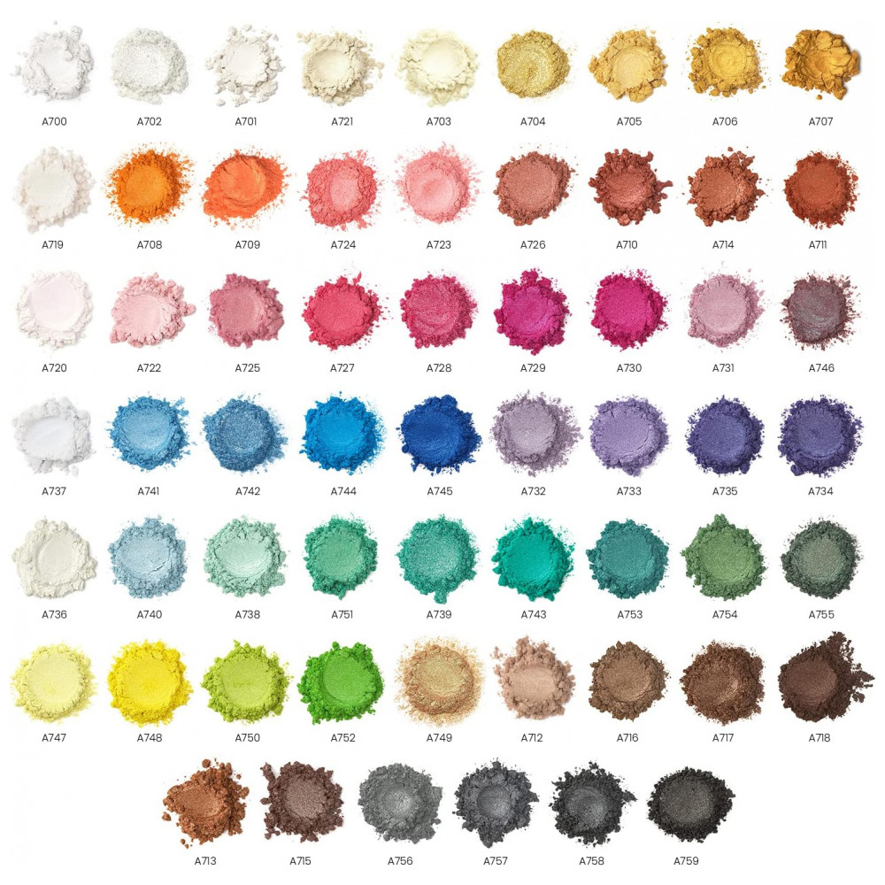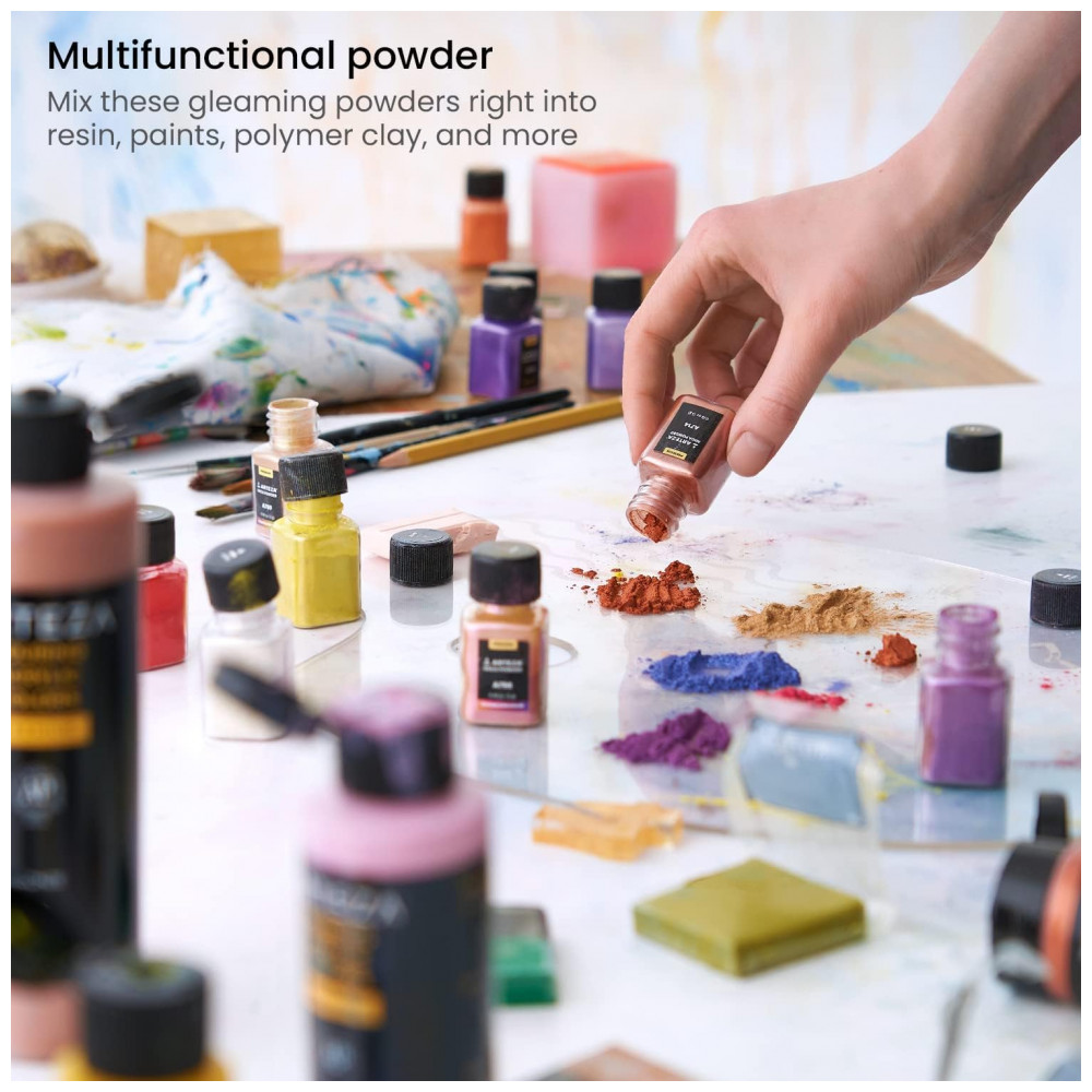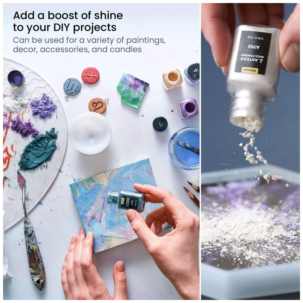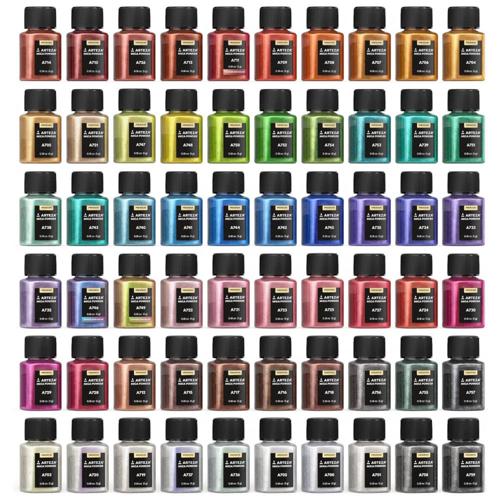 Grande variedade de cores exclusivas você obterá 60 cores exclusivas com 3 tons de camaleão e 57 tons de pó de mica metálicos para adicionar um efeito atraente ao seu artesanato. Cada cor vem em uma garrafa 0,18 oz , 5 g.
