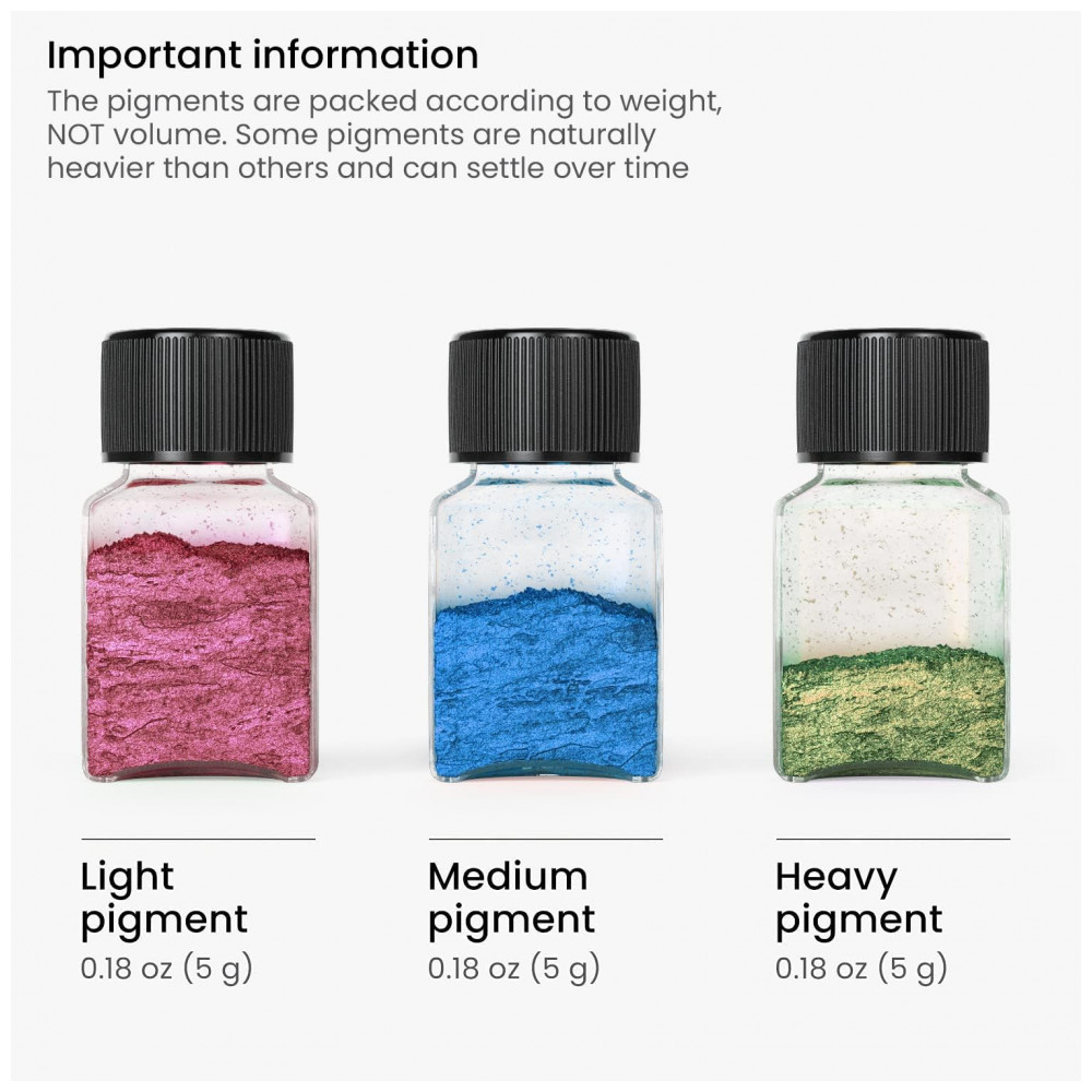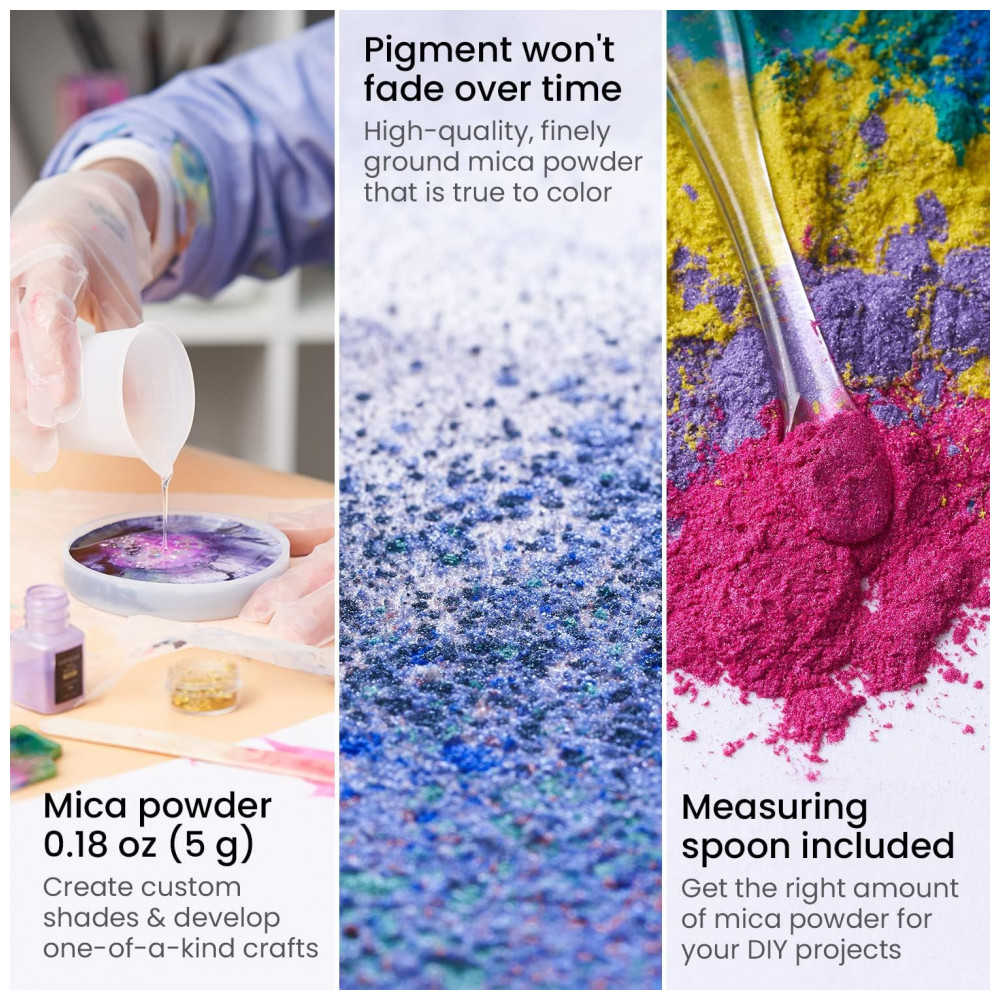 Colher de medição incluída obtenha a quantidade certa de pó de pigmento de mica sempre que iniciar um projeto com a prática colher de medição de 0,2 g incluída. Você só precisa de uma pequena quantidade para obter uma cor ousada e brilhante.