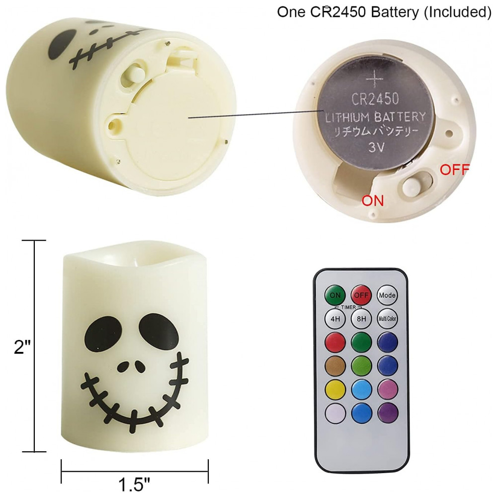 TEMPORIZADOR REMOTO: Cada caixa de vela de Halloween vem com um controle remoto de 18 teclas que permite ligar, desligar e definir o temporizador. Você pode escolher entre os modos de temporizador de 4 horas ou 8 horas para atender às suas necessidades. Uma vez que o temporizador é definido, ele ciclará a cada 24 horas.
