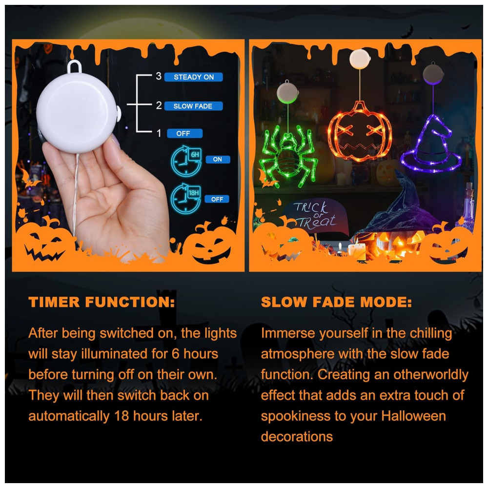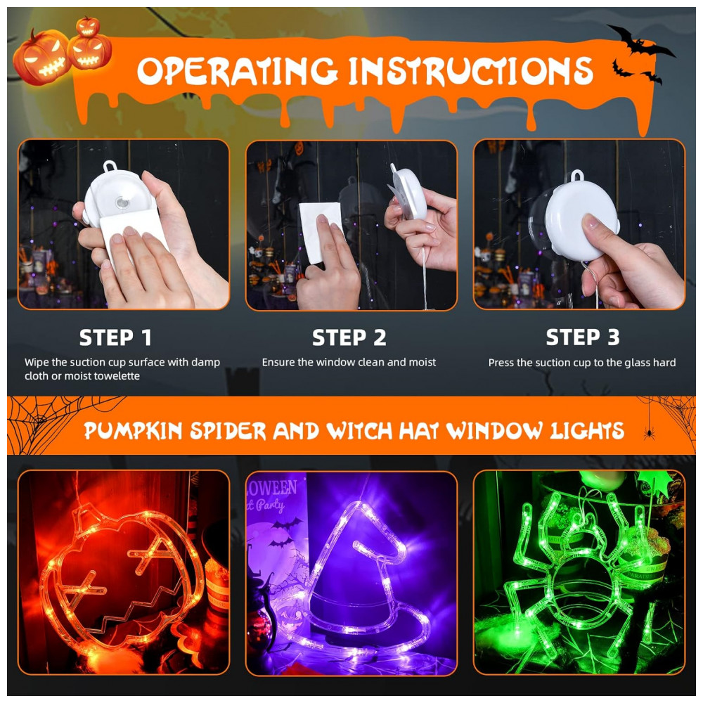 Conveniência operada por bateria: nossas luzes LED para pendurar janelas de Halloween são alimentadas por 3 pilhas AAA NÃO INCLUÍDAS. Com baixo consumo de energia, eles são s e confiáveis de usar, fornecendo uma solução de iluminação conveniente e sem preocupações para sua decoração de Halloween.