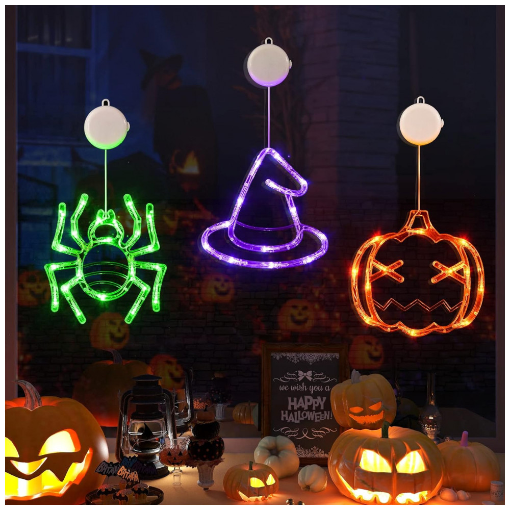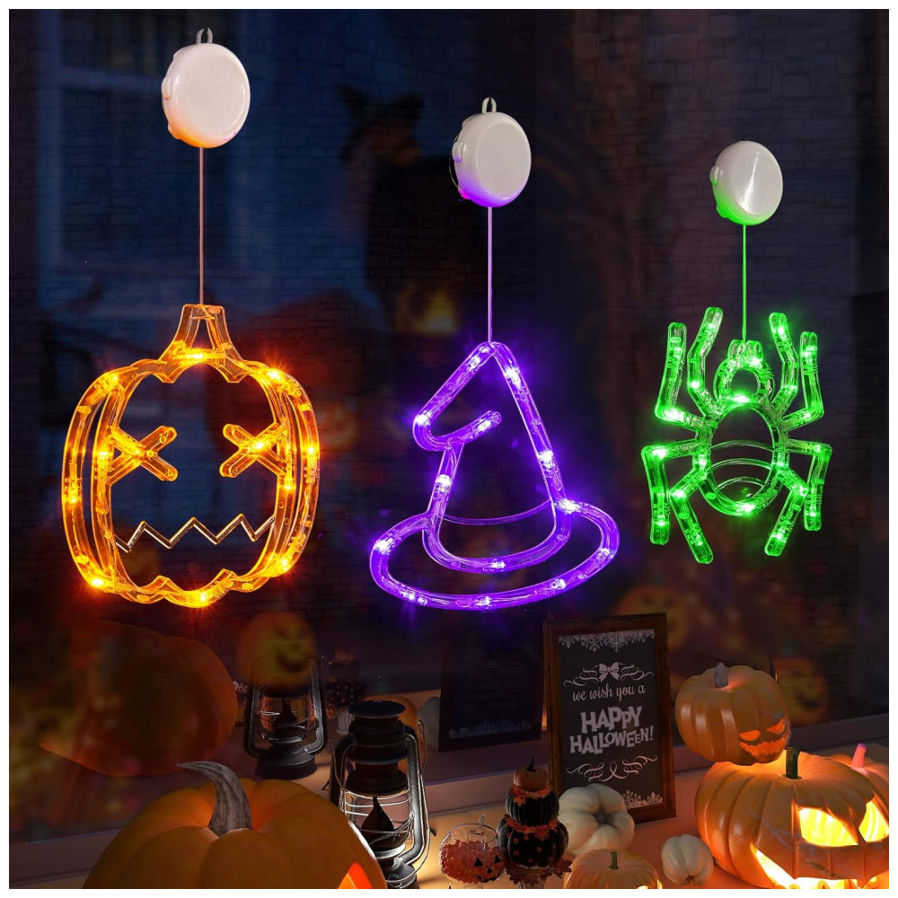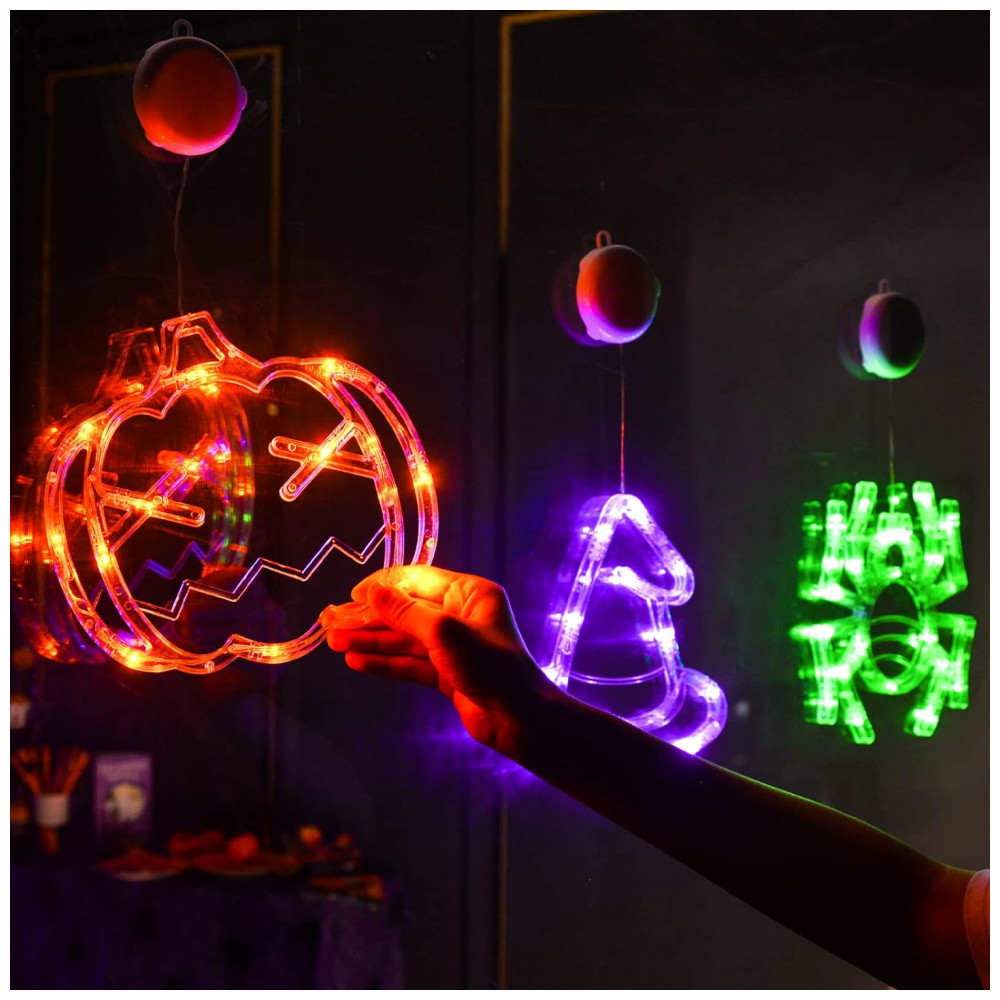 Eleve suas decorações de Halloween: melhore o aspecto assustador de sua configuração de Halloween com nosso conjunto de três luzes LED para pendurar janelas. Cada luz é projetada criativamente no formato de uma abóbora laranja, uma aranha verde e um chapéu de bruxa roxo, adicionando um toque extravagante às suas janelas com tema de Halloween. Os enfeites de janela de Halloween têm um diâmetro de 20,07 centímetros e o barbante cai 45,01 centímetros, garantindo que chamem a atenção sem sobrecarregar o espaço da janela.