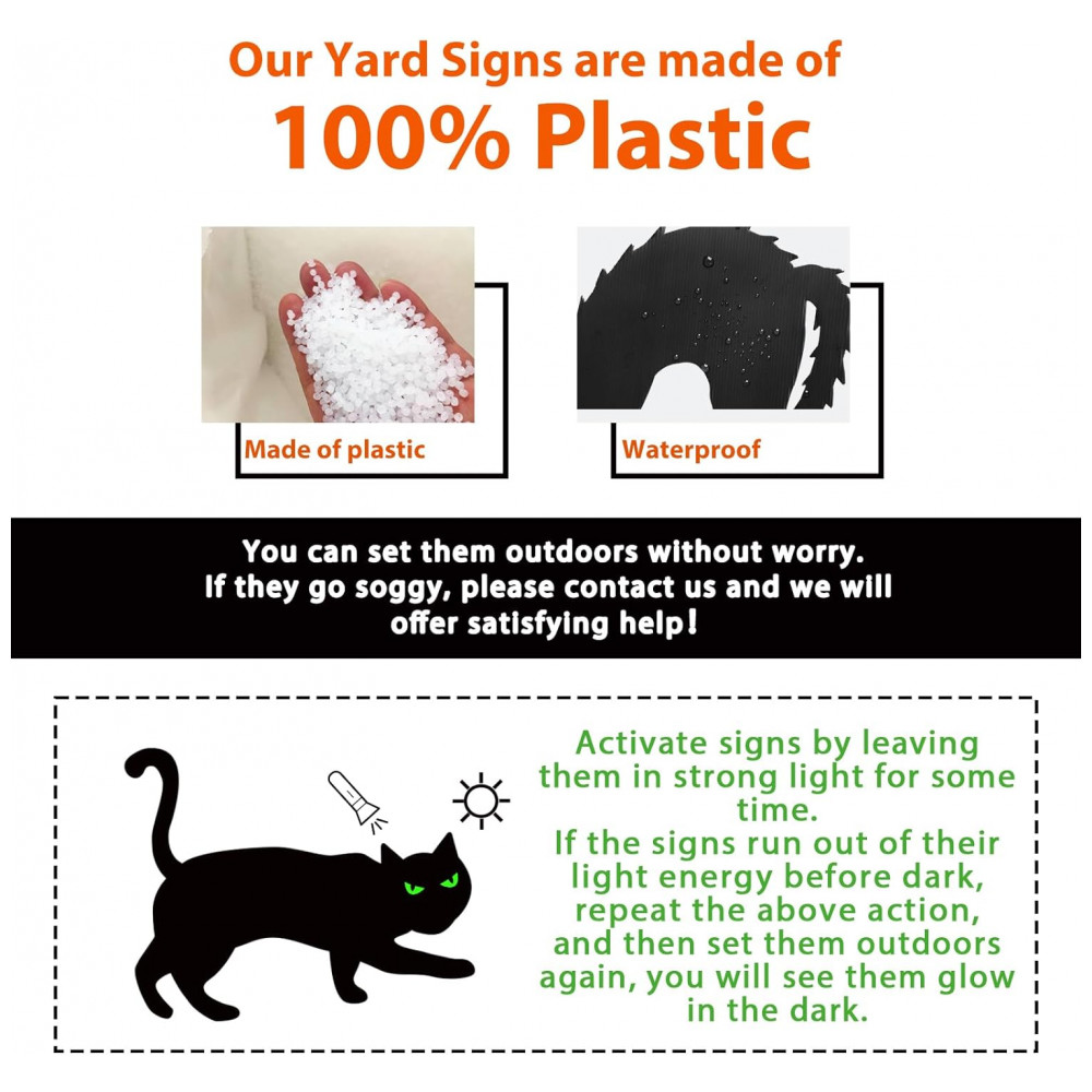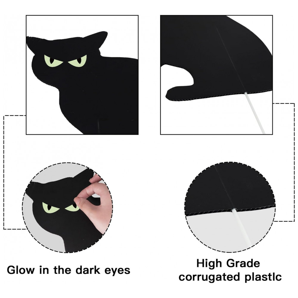 INCLUIÇÕES DO PACOTE: Silhueta de gato preto assustador de 6 quilates Sinais de quintal de Halloween, 16 estacas, 24pcs brilham em adesivos de olhos escuros. Definindo o clima assustador para o quintal de Halloween.